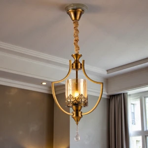 Royal Gold Finish Metal Amber Glass Shade with Crystal Drops Hanging Light - Warm White