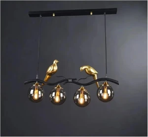 Artistic Bird Pendant Chandelier with 4 Glass Shades Black & Gold Hanging Light - Warm White