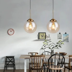 Amber Glass Globe Pendant Light with Gold Finish Holder Hanging Light - Warm White