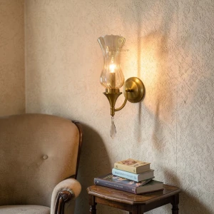 Antique Gold Wall Sconce with Glass Shades & Crystal Drop Wall Lamp - Warm White