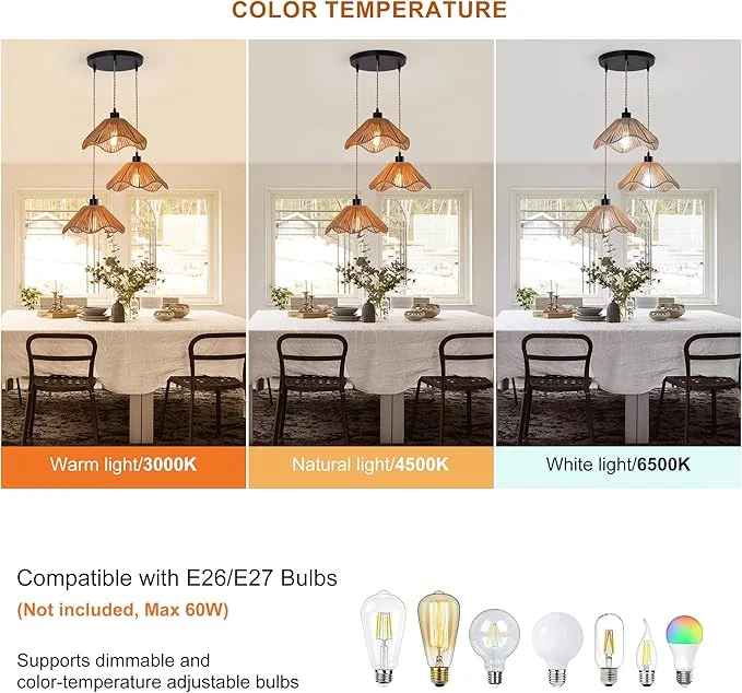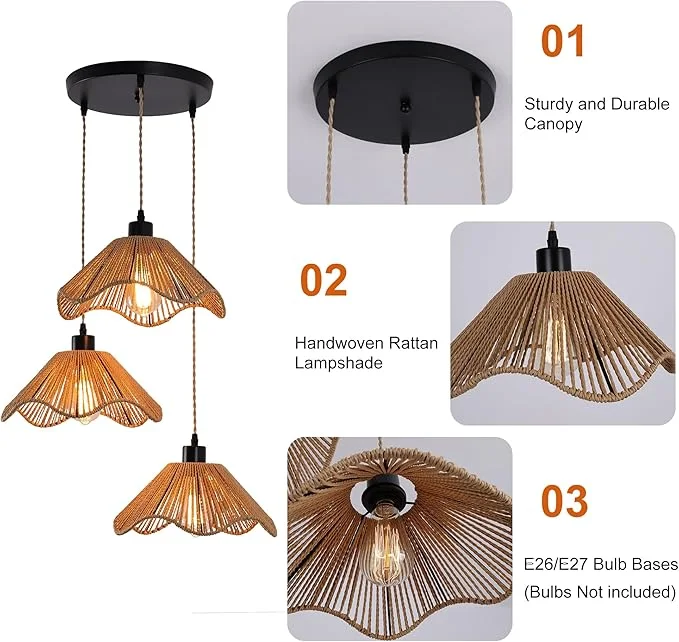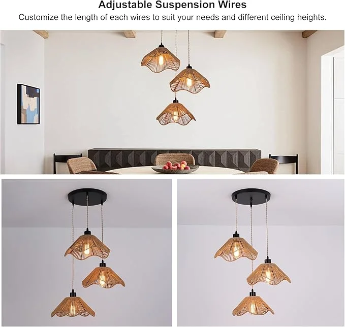 Add a warm and natural charm to your interiors with this beautifully designed 3-Light Rattan Hanging Pendant Light. Crafted with finely woven rattan shades, this fixture brings a perfect blend of bohemian style and modern elegance, making it an eye-catching addition to any space.