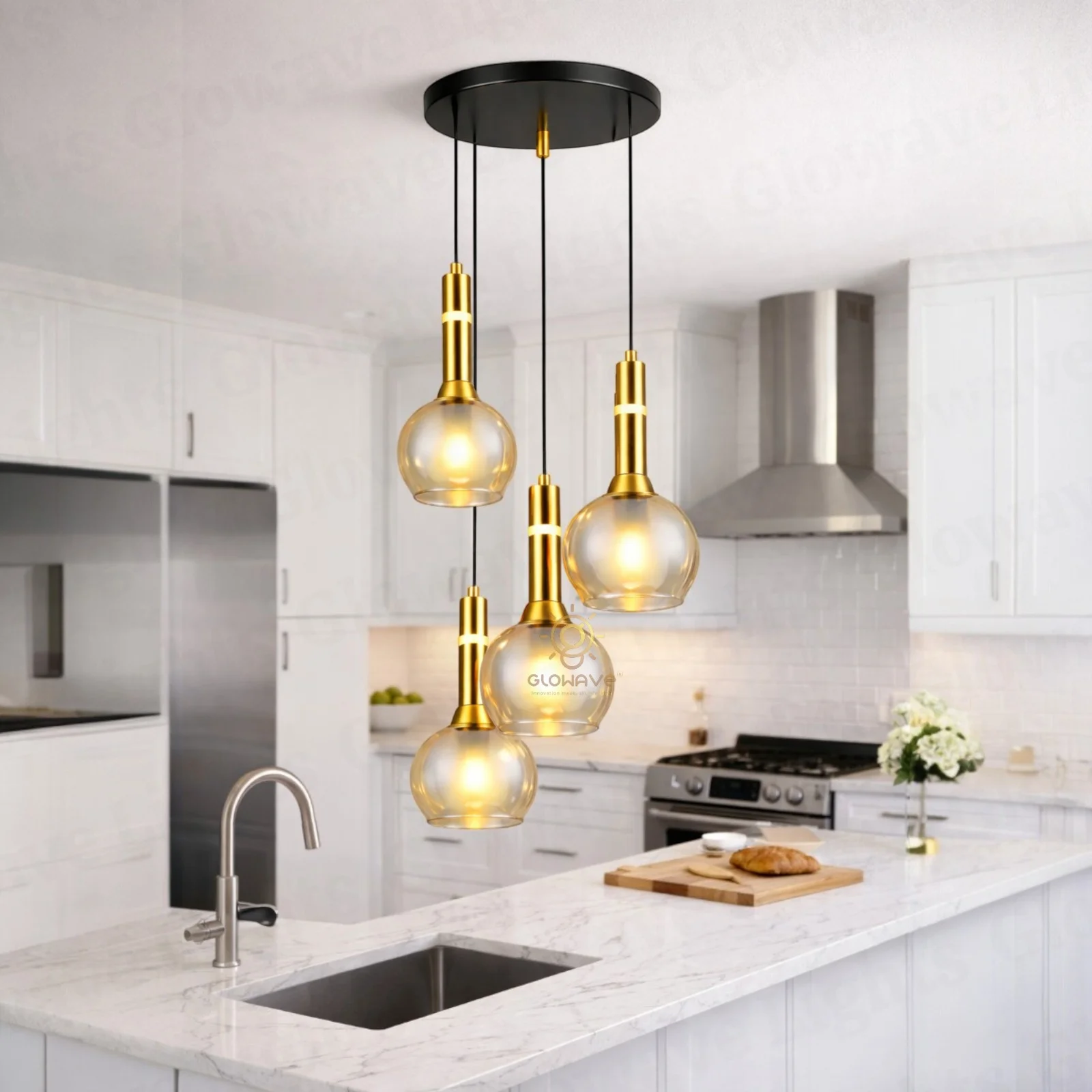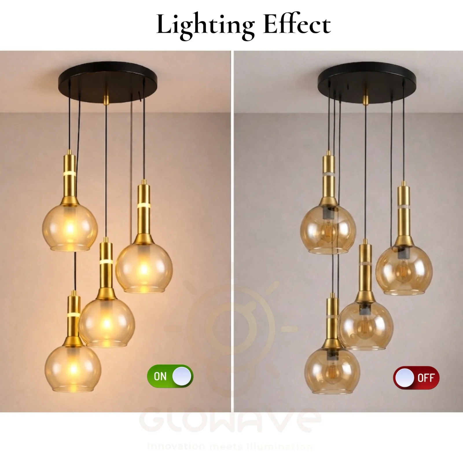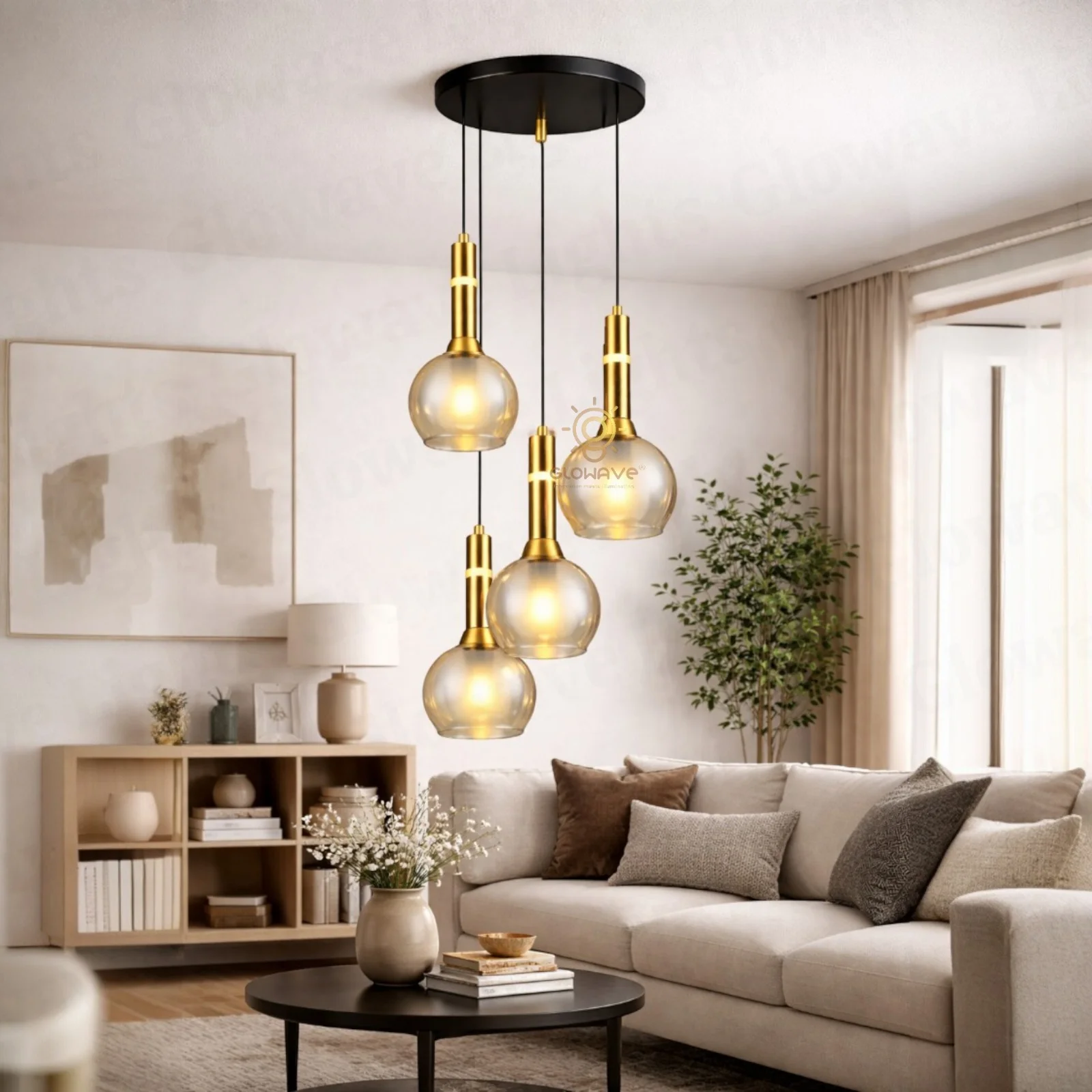 Bring a perfect blend of luxury and warmth into your home with this stunning 4-Light Pendant Hanging Lamp. Designed with premium amber glass shades and a sleek gold finish, this ceiling light creates a cozy, inviting glow that transforms any room into a sophisticated living space. Crafted with high-quality metal and beautifully tinted amber glass, this hanging light delivers a rich, modern aesthetic. The gold accents add a touch of elegance, making it an ideal centerpiece for both contemporary and classic interiors.