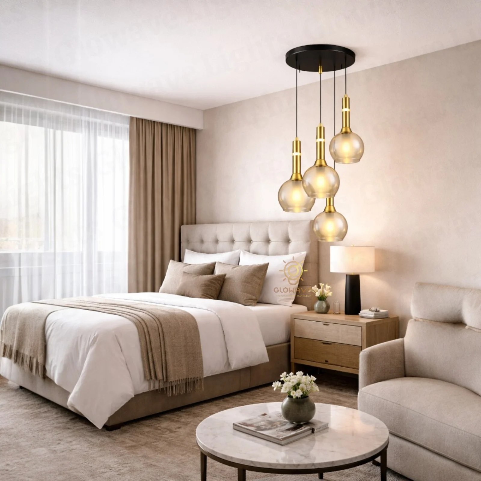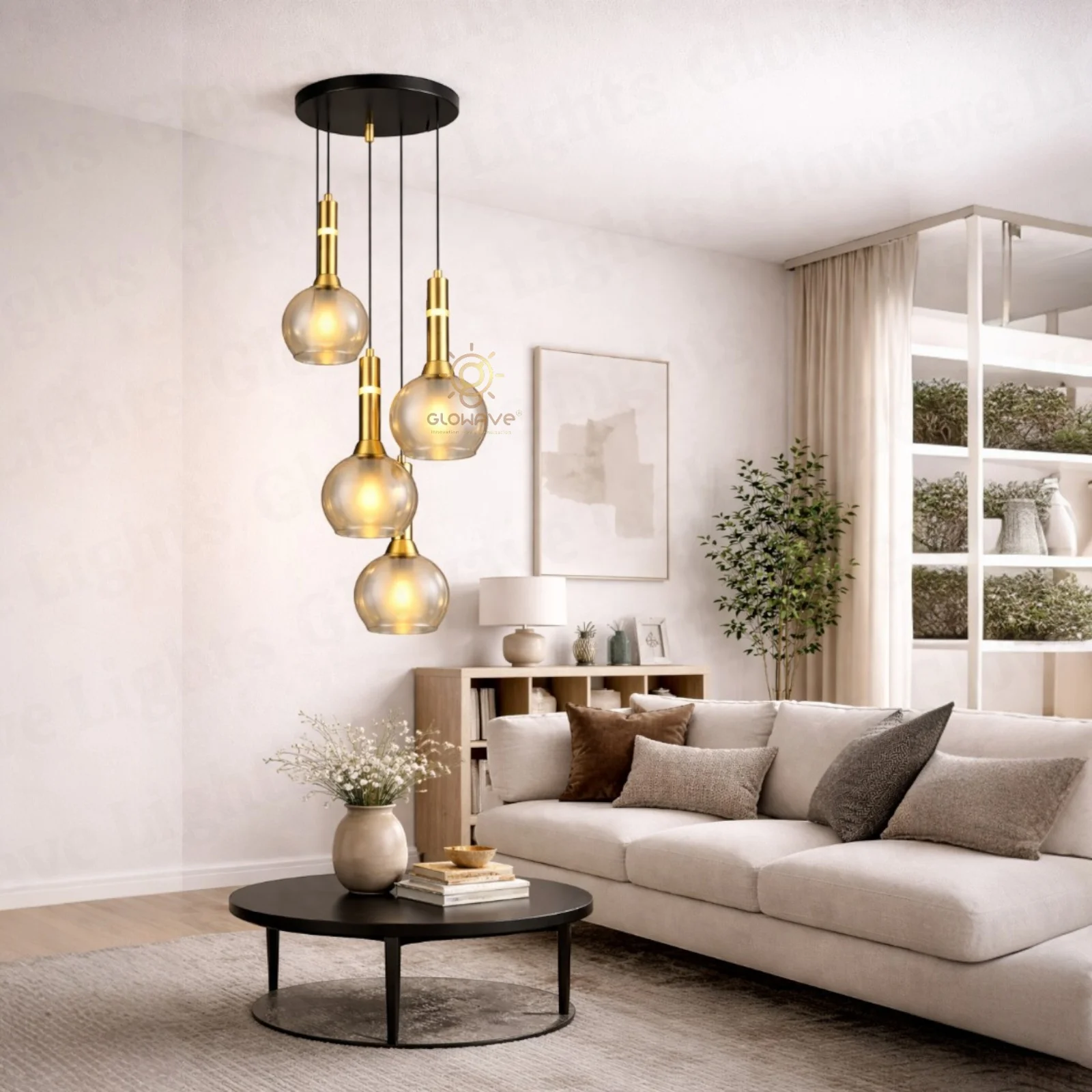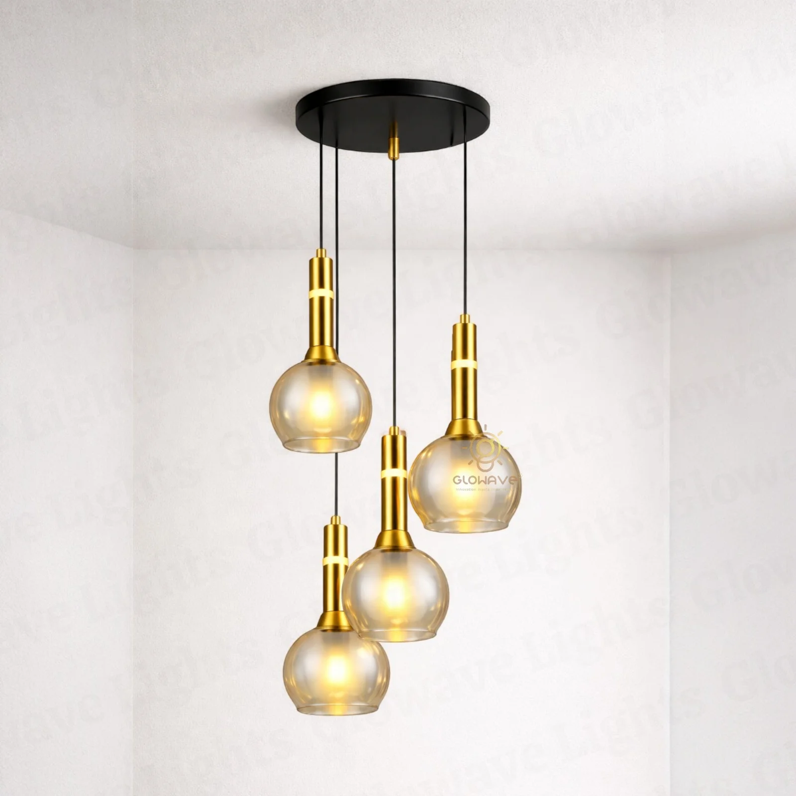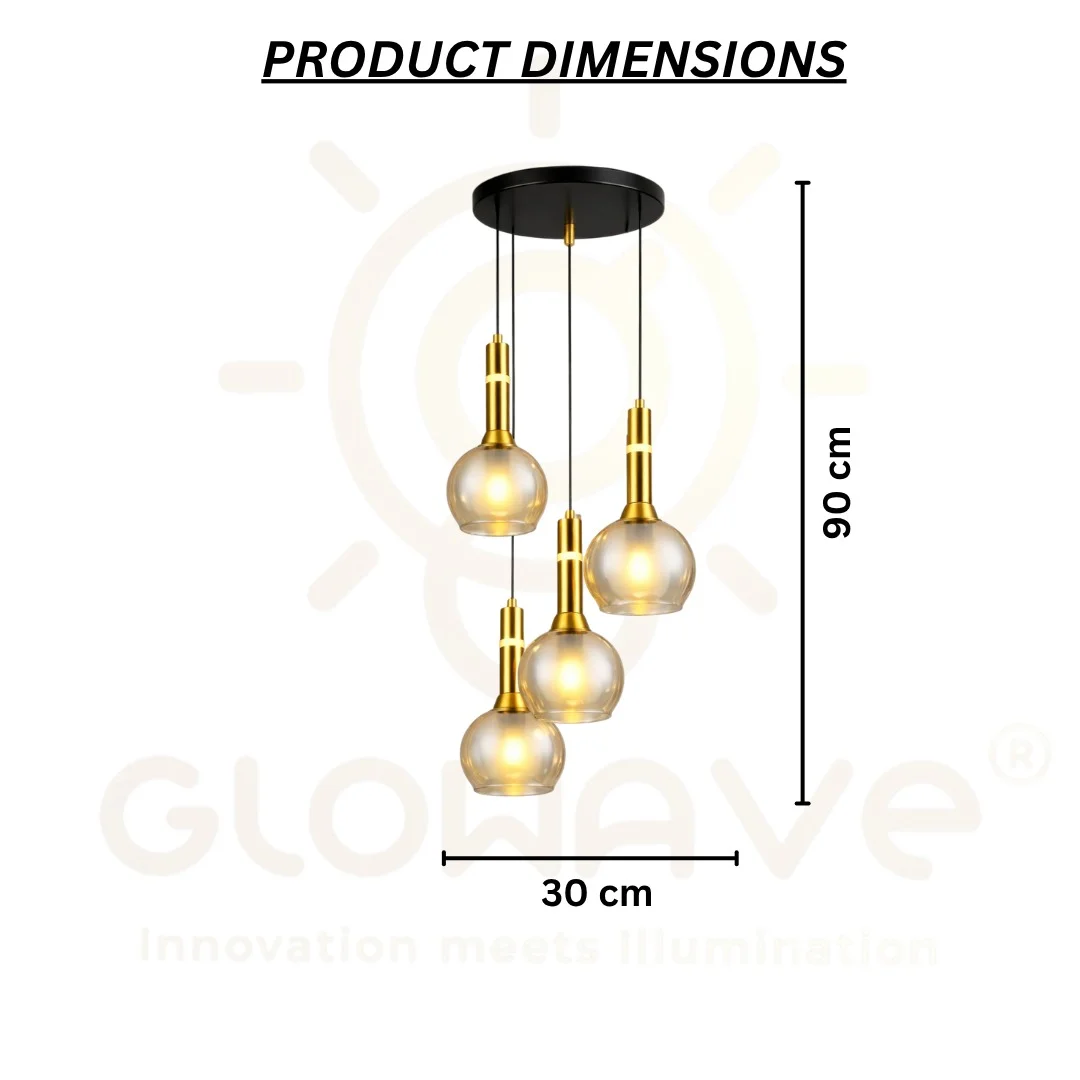 Bring a perfect blend of luxury and warmth into your home with this stunning 4-Light Pendant Hanging Lamp. Designed with premium amber glass shades and a sleek gold finish, this ceiling light creates a cozy, inviting glow that transforms any room into a sophisticated living space. Crafted with high-quality metal and beautifully tinted amber glass, this hanging light delivers a rich, modern aesthetic. The gold accents add a touch of elegance, making it an ideal centerpiece for both contemporary and classic interiors.