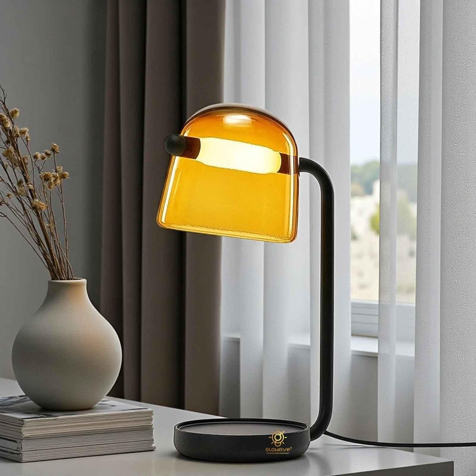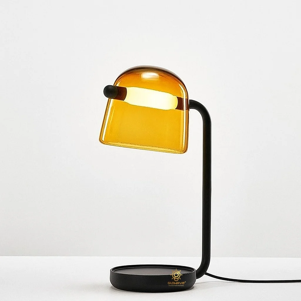 Illuminate your space with the elegant Glowave Glass Shade Amber Base Desk Table Lamp. Designed for both home and office use, this lamp seamlessly blends modern aesthetics with functional lighting. Featuring a sleek black base and a stylish glass shade, it casts a soft, warm white glow, perfect for creating a cozy and inviting atmosphere. Whether you're working at your desk, reading, or adding a touch of ambiance to your living room, this lamp is the ideal choice. The bulb is included, ensuring hassle-free setup and energy-efficient lighting. Enhance the beauty of your space while enjoying the perfect balance of style and practicality.