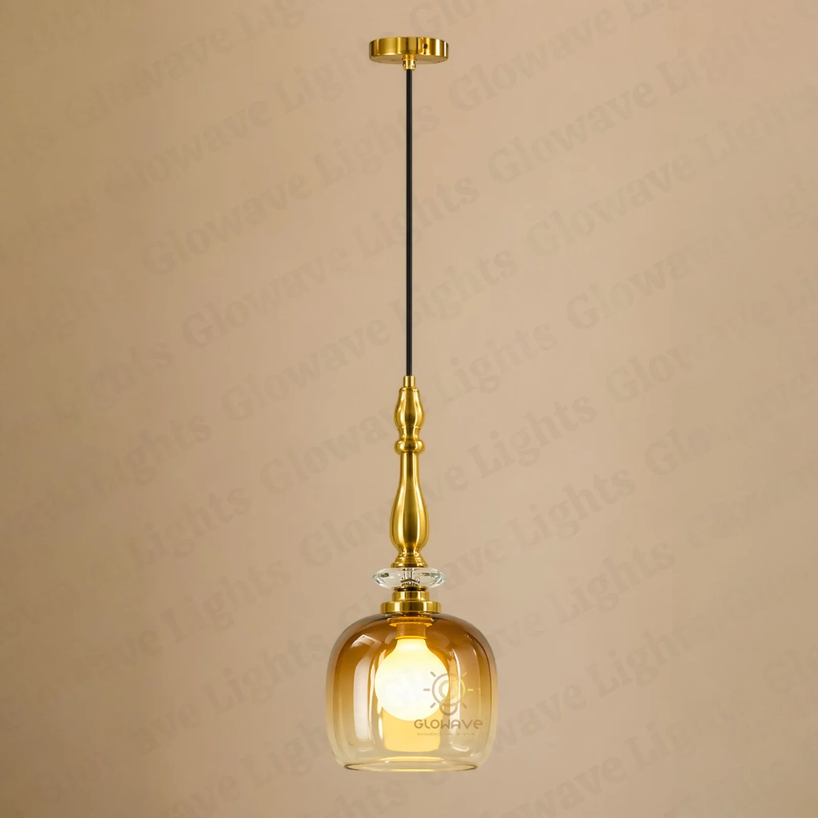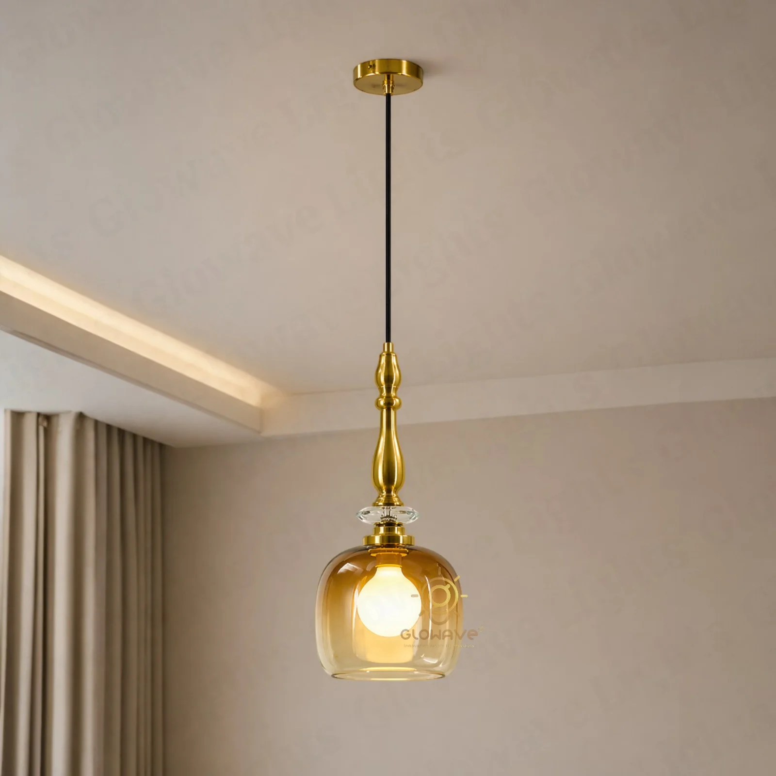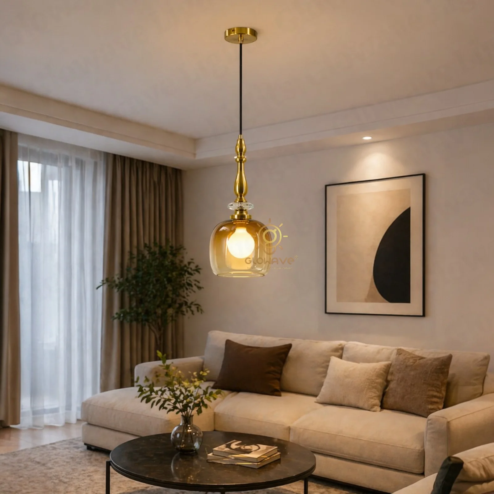 Add a touch of warmth and elegance to your space with this modern amber glass pendant light, designed to elevate contemporary interiors. Featuring a beautifully crafted amber-tinted glass shade, this hanging light creates a soft, diffused glow that enhances the ambiance of any room. The sleek gold-finished metal body paired with a minimalist hanging design offers a perfect balance of luxury and simplicity. Its warm illumination makes it ideal for creating a cozy atmosphere in living rooms, dining areas, bedrooms, cafés, and kitchen islands.