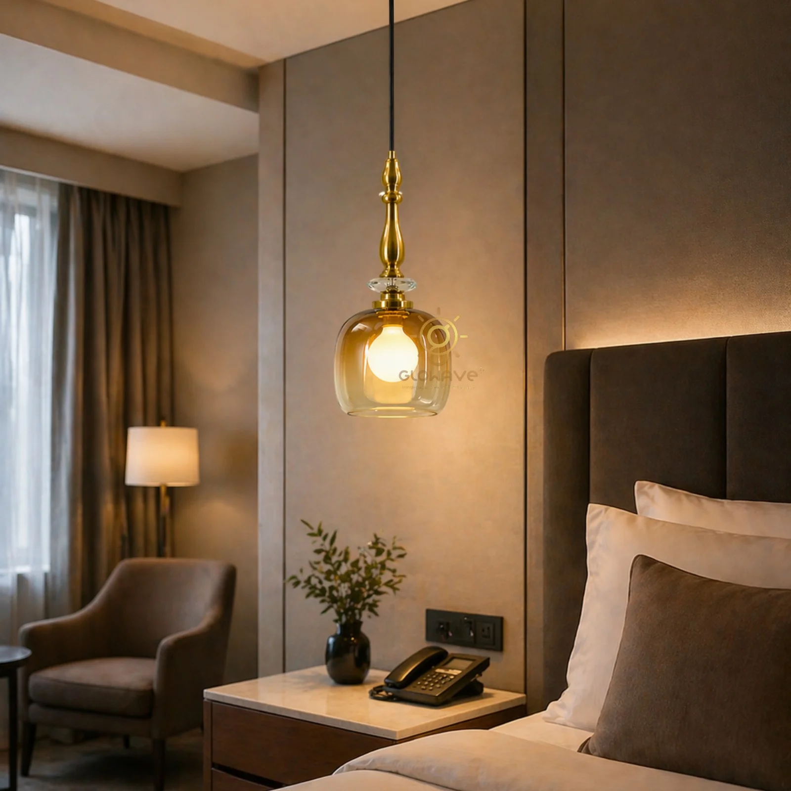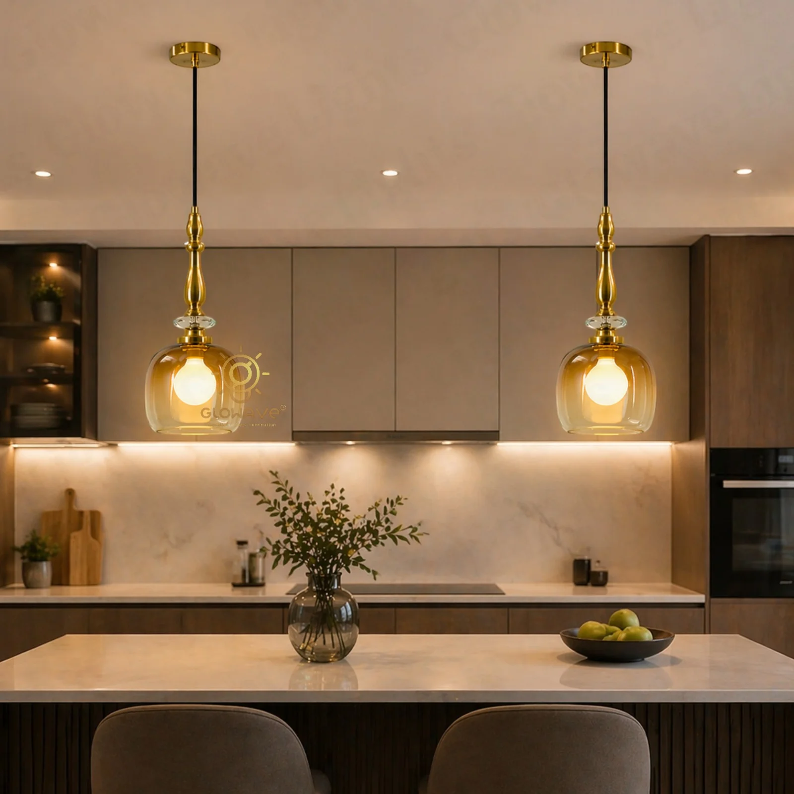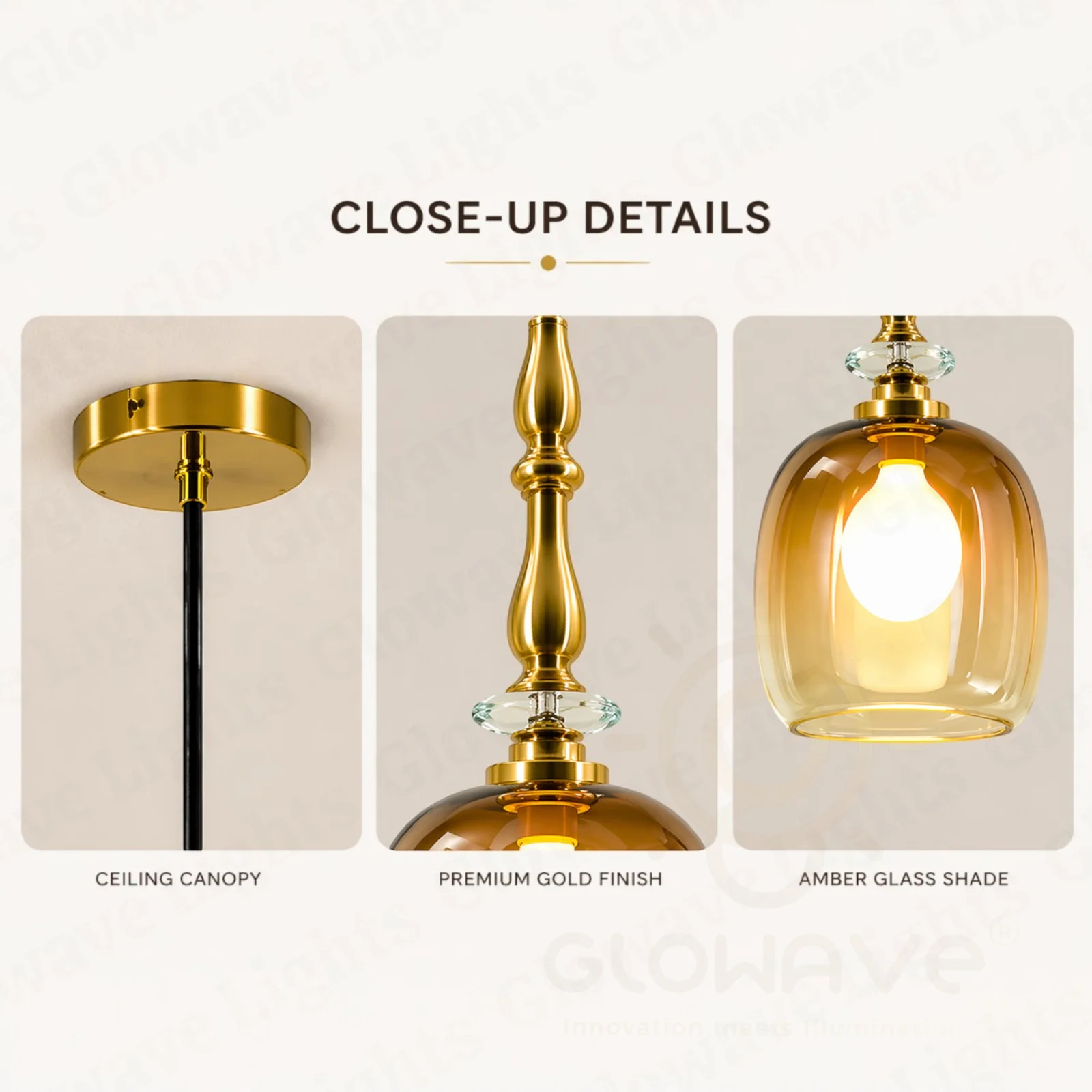 Add a touch of warmth and elegance to your space with this modern amber glass pendant light, designed to elevate contemporary interiors. Featuring a beautifully crafted amber-tinted glass shade, this hanging light creates a soft, diffused glow that enhances the ambiance of any room. The sleek gold-finished metal body paired with a minimalist hanging design offers a perfect balance of luxury and simplicity. Its warm illumination makes it ideal for creating a cozy atmosphere in living rooms, dining areas, bedrooms, cafés, and kitchen islands.