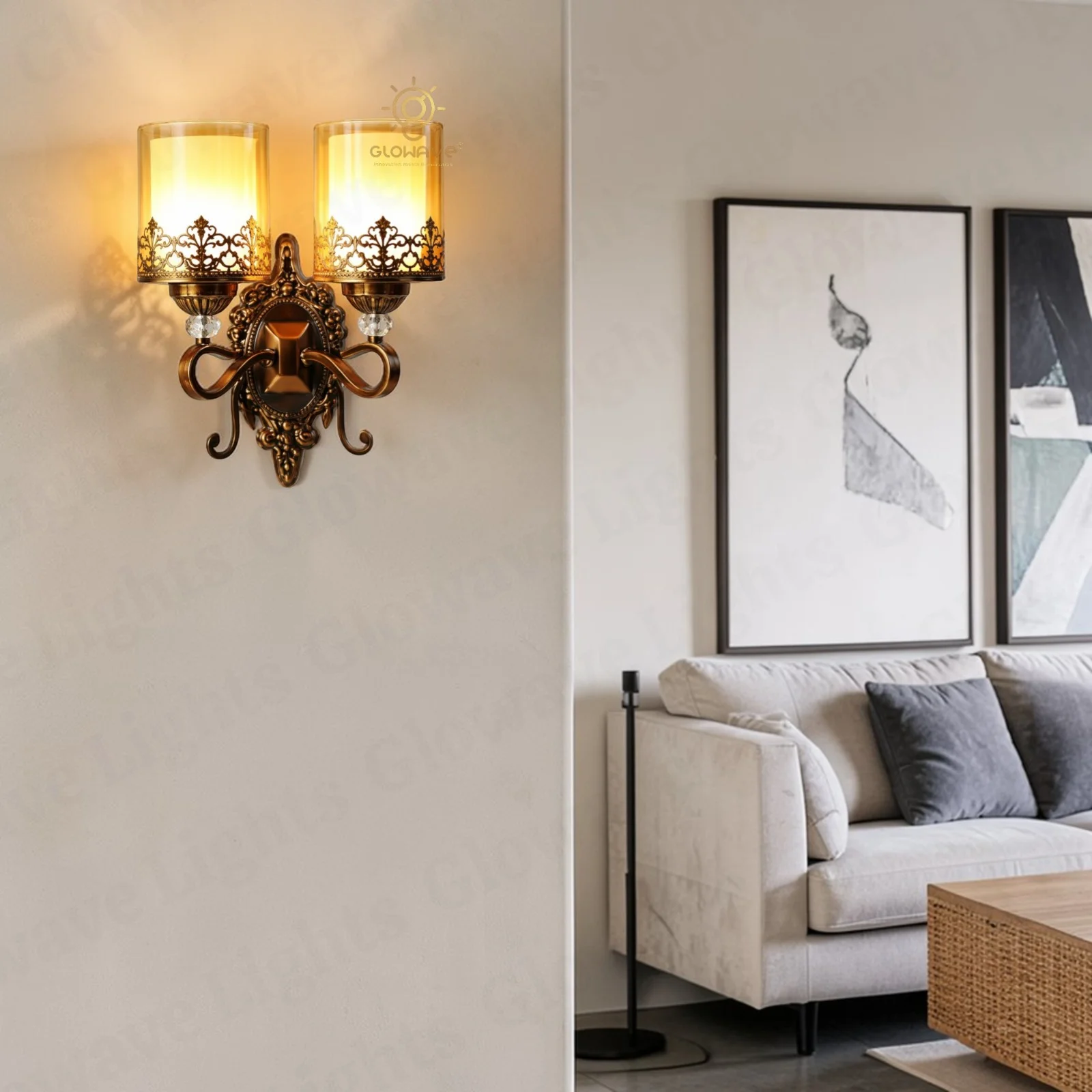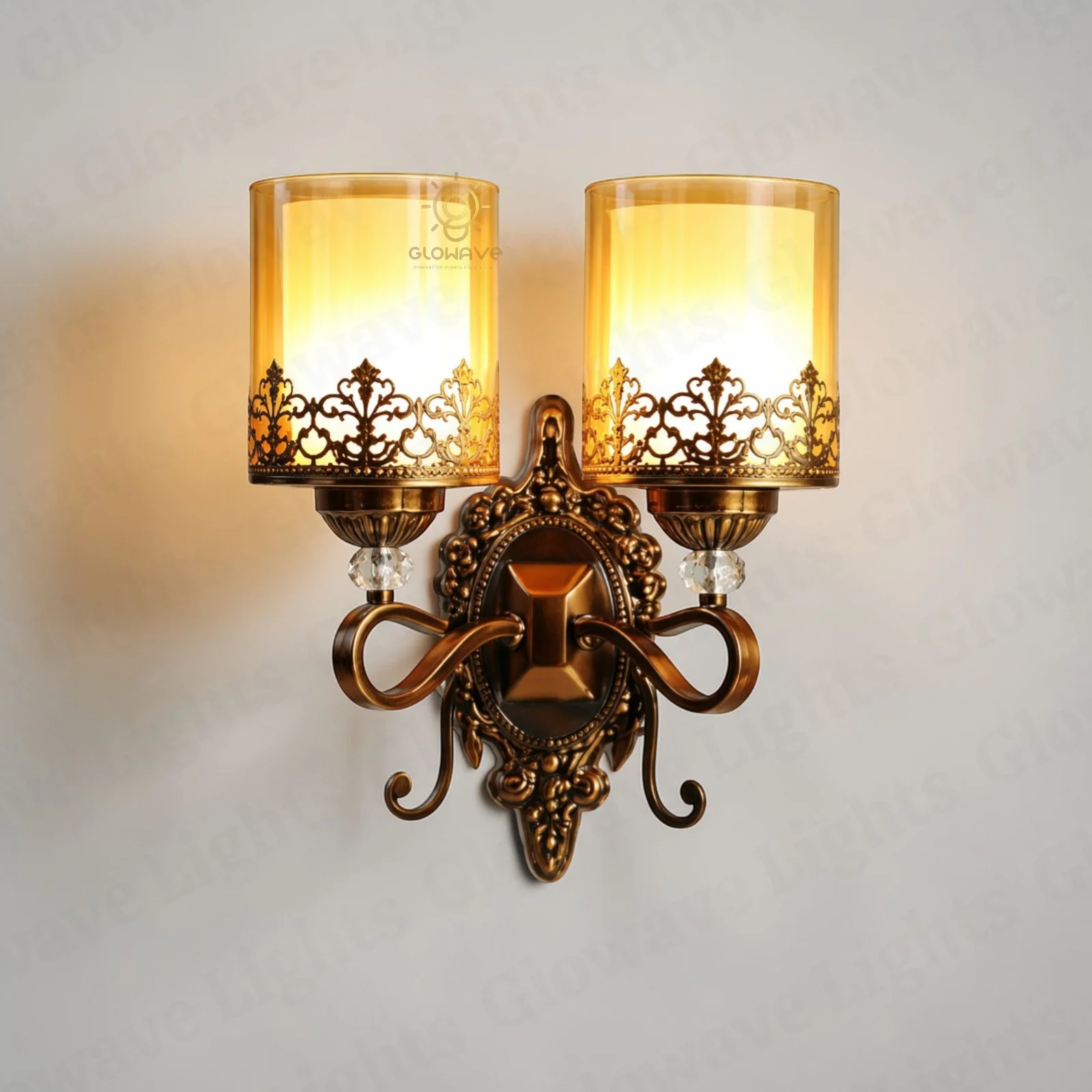 Add a touch of timeless elegance to your interiors with this vintage double head wall light featuring decorative glass shades and an antique bronze finish. Designed with intricate detailing and gracefully curved arms, this wall sconce brings a classic and luxurious charm to any space. The beautifully patterned glass shades create a warm and inviting glow, enhancing the overall ambience of your room.