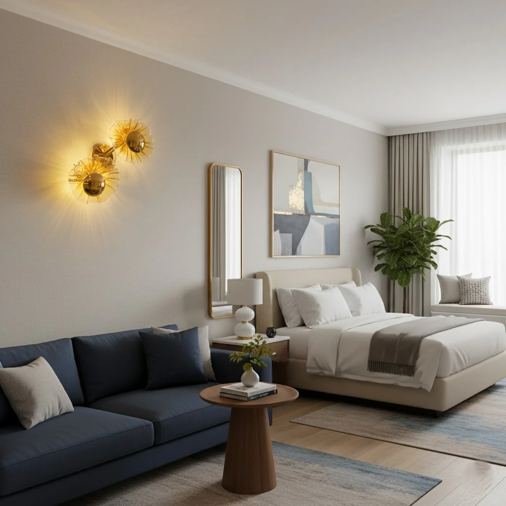 Elevate your living space with the Modern Double Amber Glass Golden Finish LED Wall Lamp. This elegant lighting fixture, perfect for your living room, bedroom, or bedside, features a sleek golden finish and contemporary glass balls design. It provides a warm white glow that creates a cozy ambiance.