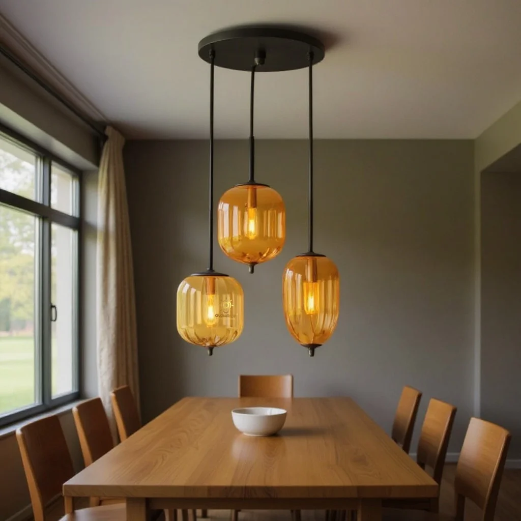 European Golden Amber Glass Set of 3 Pendant Hanging Light - Warm White