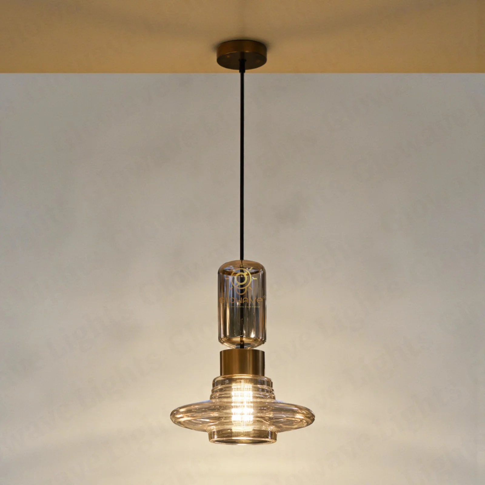 When illuminated, the layered glass gently diffuses light, producing a warm and inviting glow that enhances dining areas, kitchen islands, bedside corners, and living spaces. The vertical suspension design adds depth and character, making it an ideal choice for both residential and premium commercial interiors.