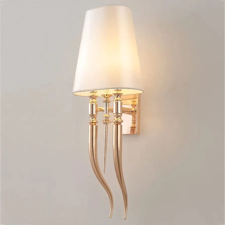 Enhance your home decor with the Gold Finish Base White Fabric Lampshade Wall Lamp. This exquisite sconce fixture, perfect for living rooms, bedrooms, and bedsides, boasts a timeless antique brass finish and amber glass design. It casts a warm white light, creating a cozy and nostalgic atmosphere. Ideal for adding vintage charm to any space.