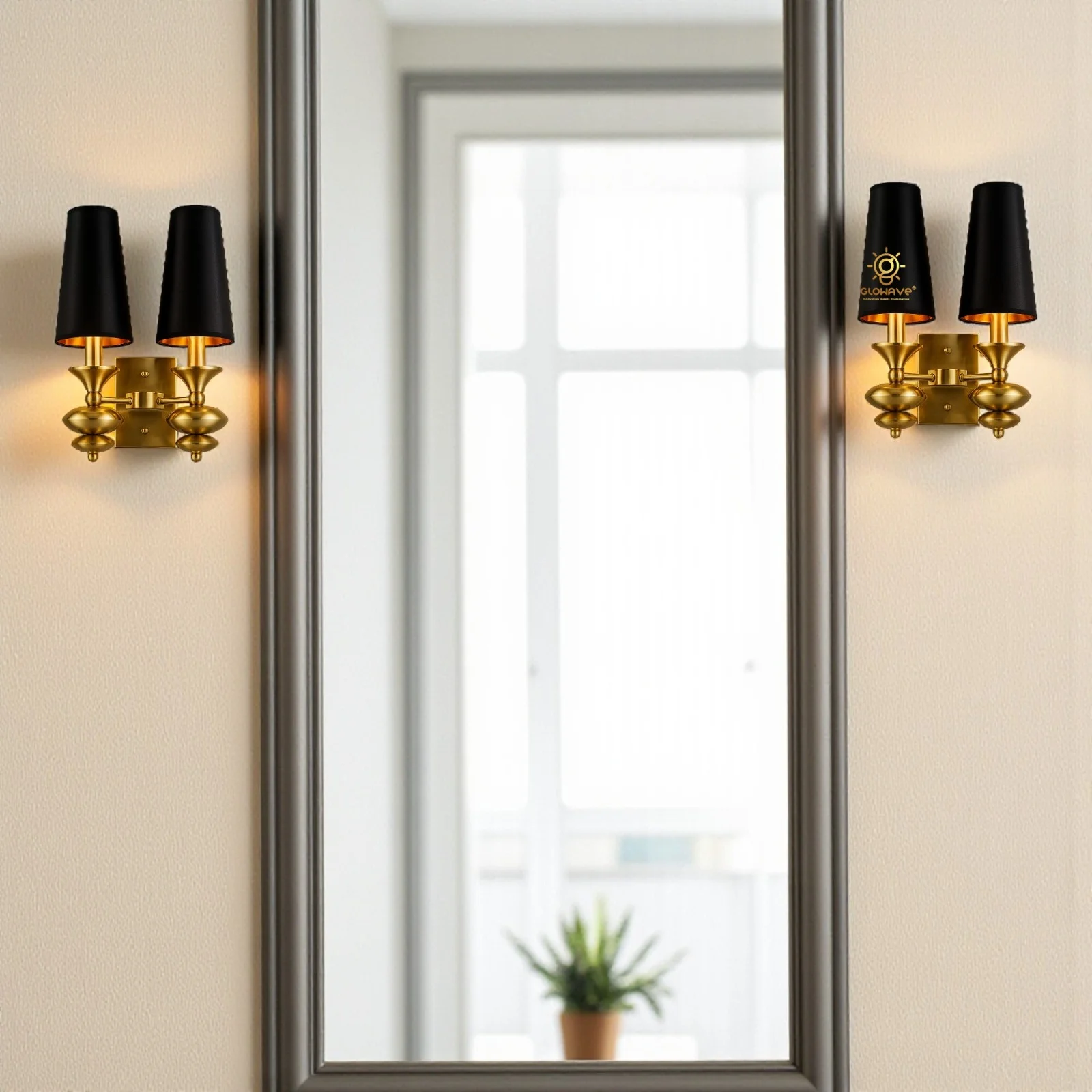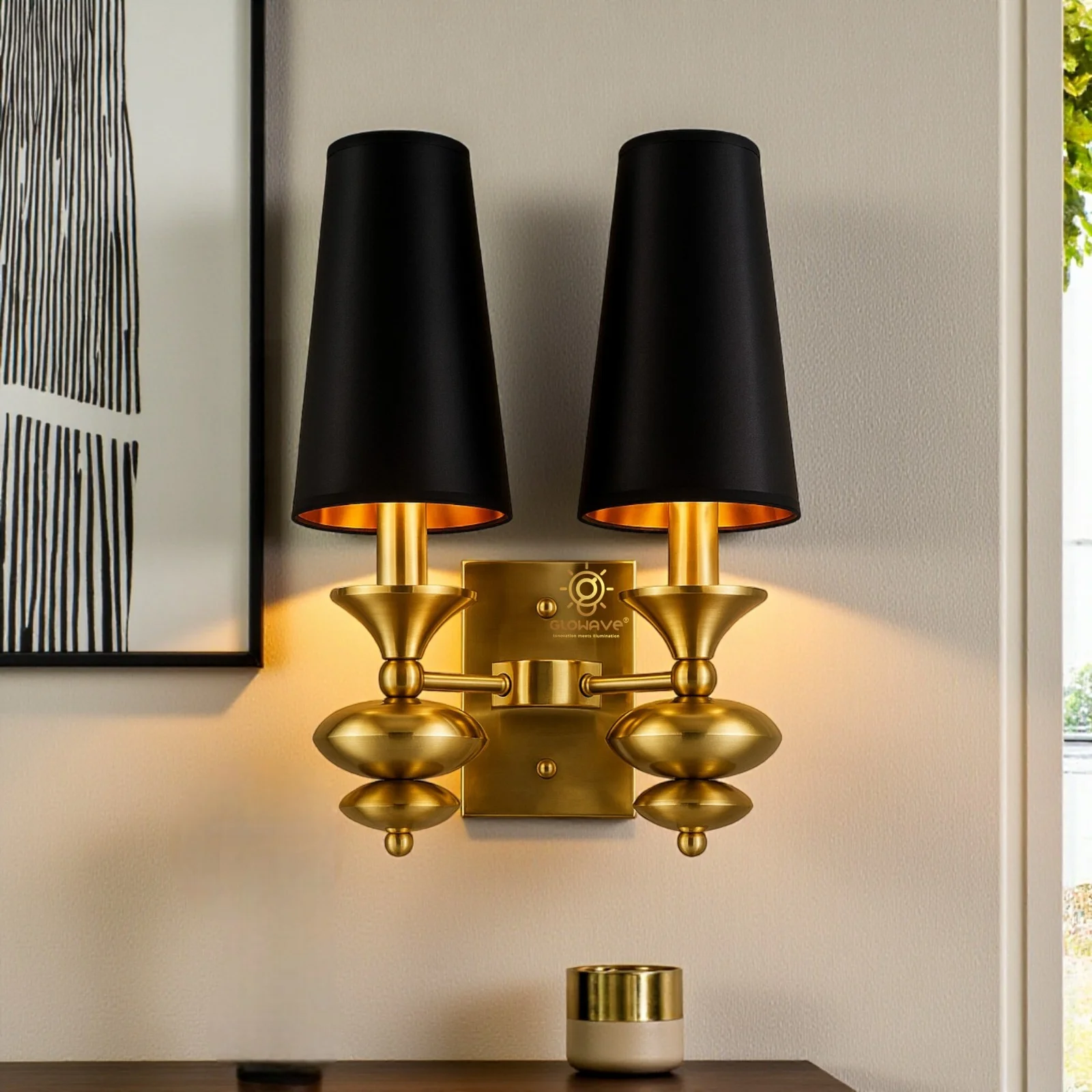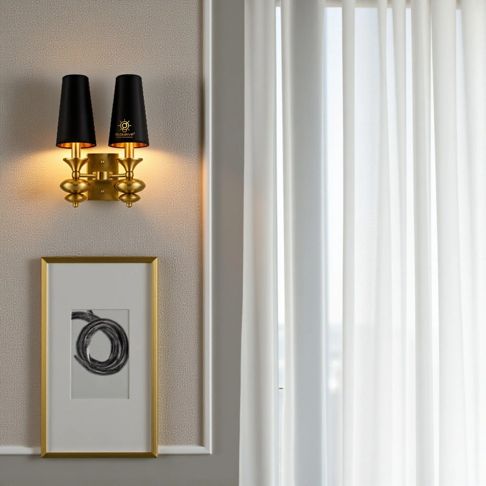 - Stylish Design: Gold Finish Black Fabric Shade Wall Sconce.
