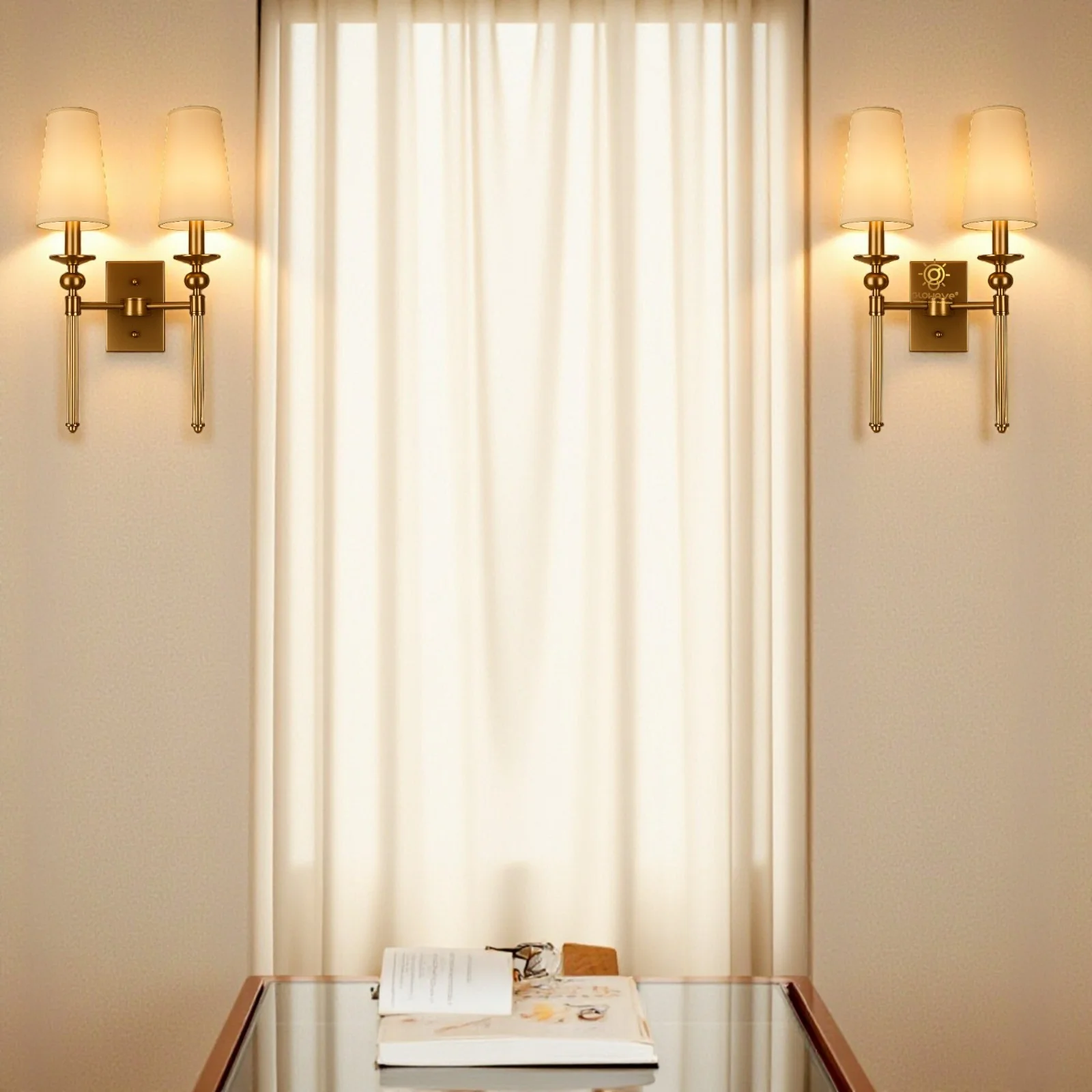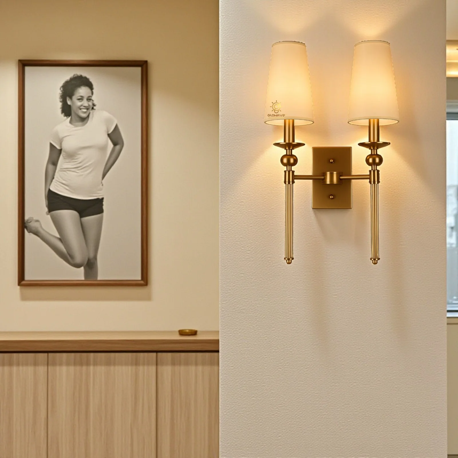 Gold Finish Dual Head Fabric Lampshade Wall Lamp - Warm White