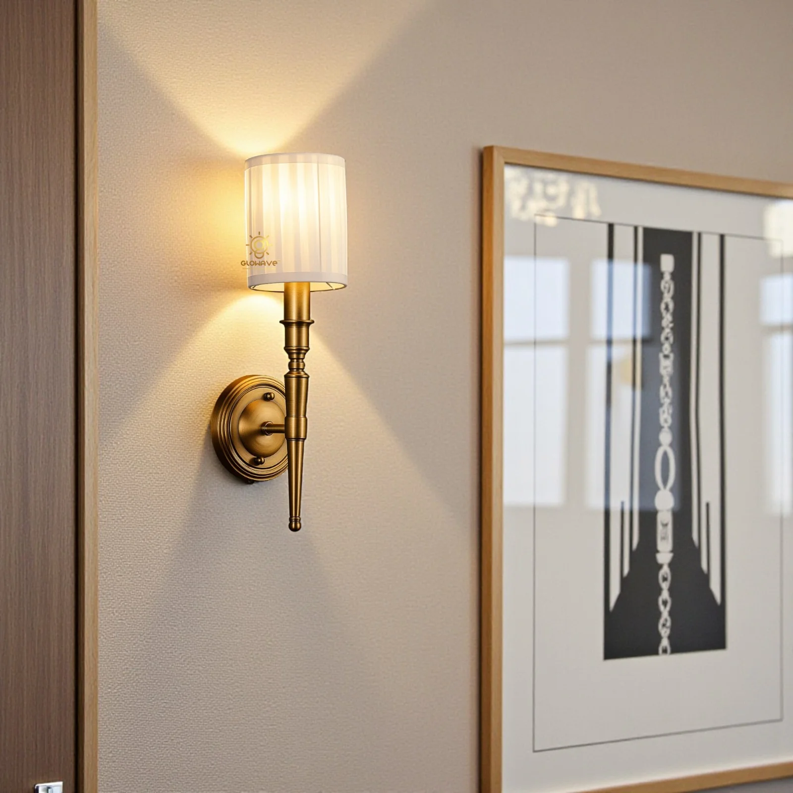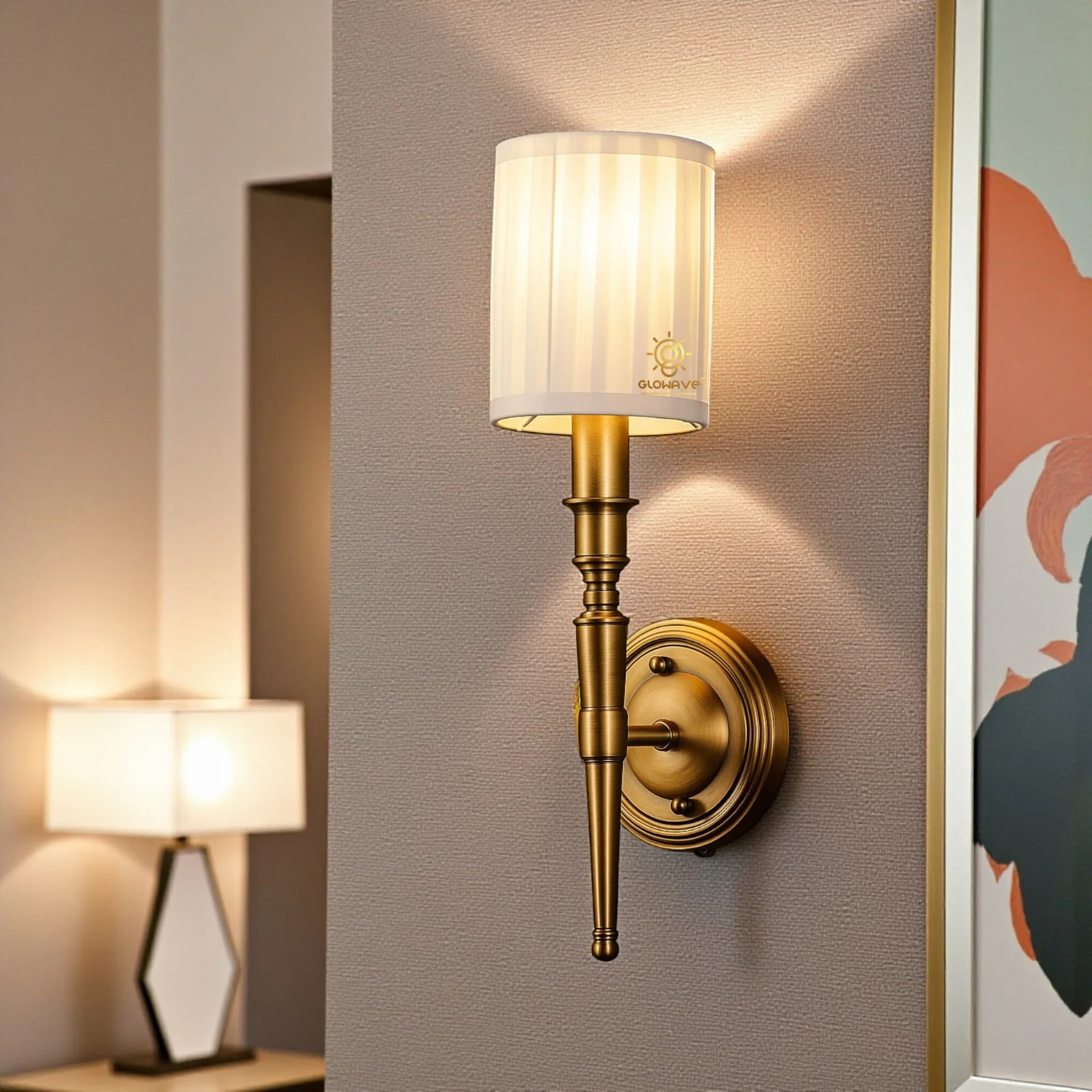 - Stylish Design: Gold Finish Metal Body Fabric Shade Wall Sconce.