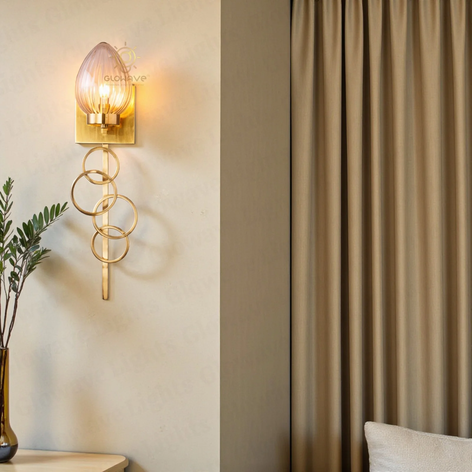 Bring refined elegance and artistic charm to your interiors with this luxurious designer wall light. Featuring a beautifully crafted ribbed glass shade, this wall lamp emits a warm, soothing glow that enhances the ambience of any space. The rich gold-finish metal body adds a touch of sophistication, while the sculptural circular ring detailing creates a striking visual statement.