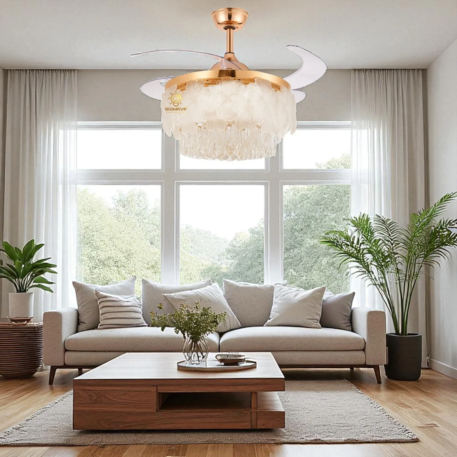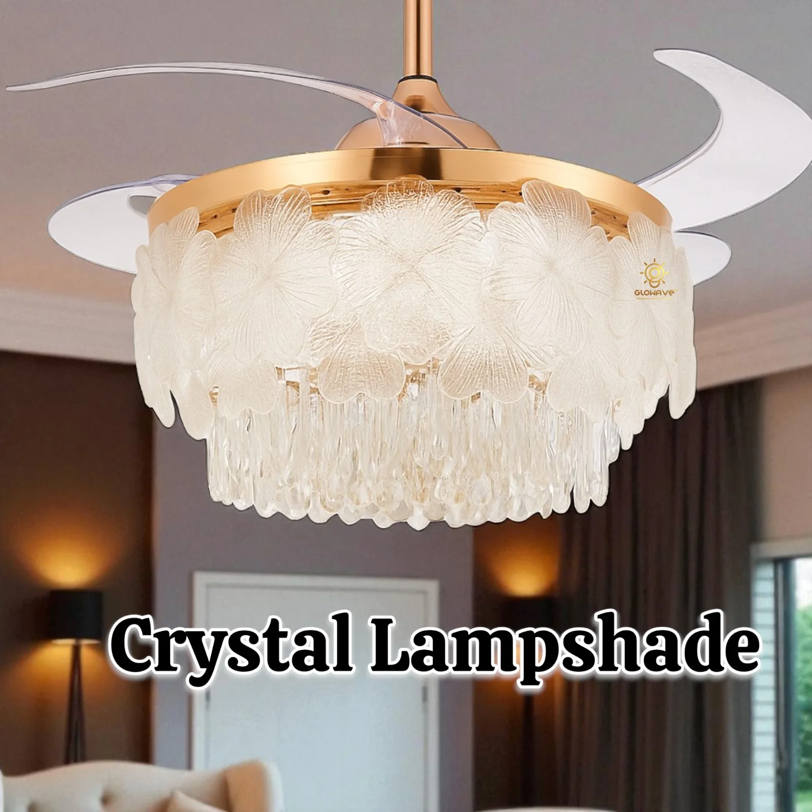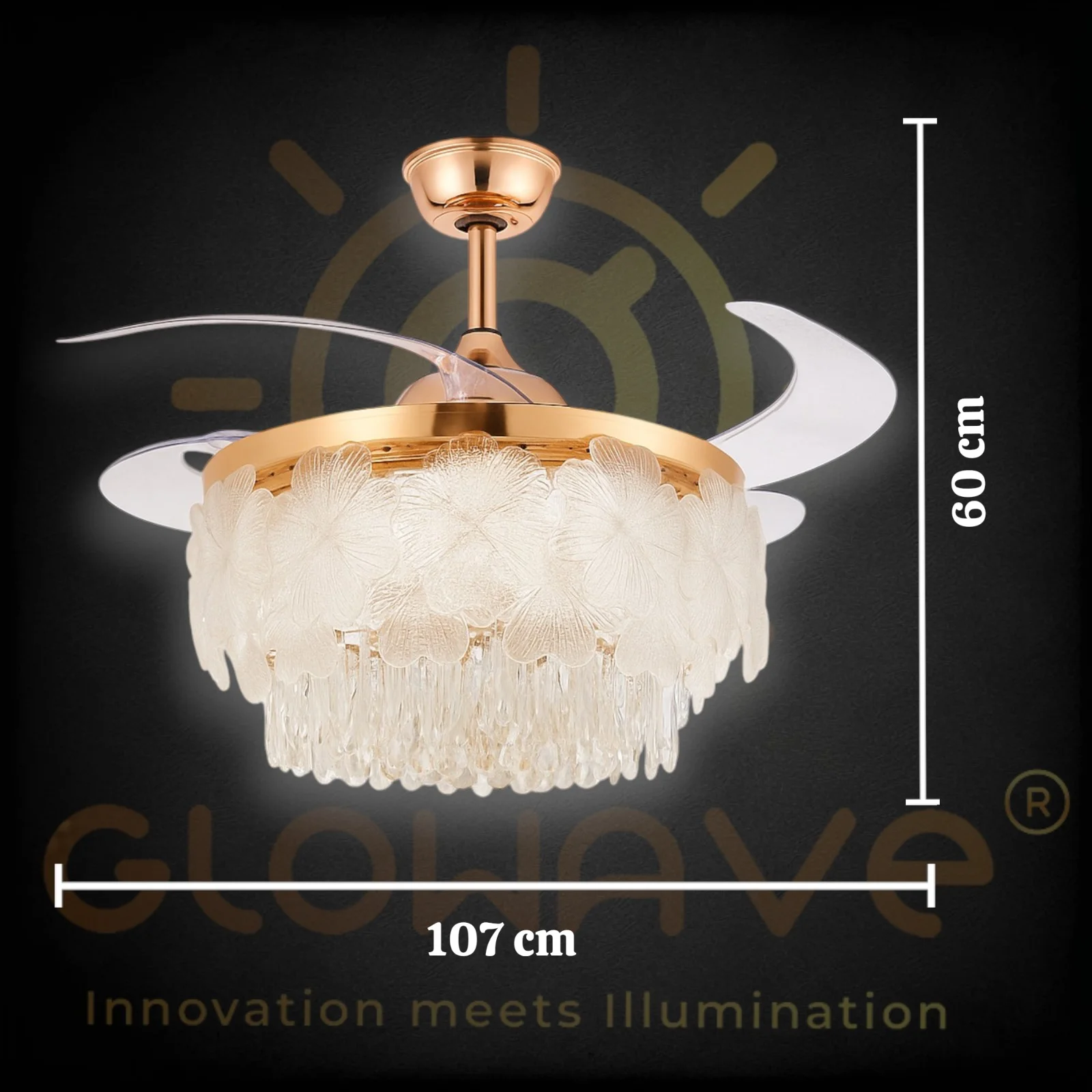 Luxury Gold Crystal Retractable Ceiling Fan with LED Chandelier Light - Tricolor