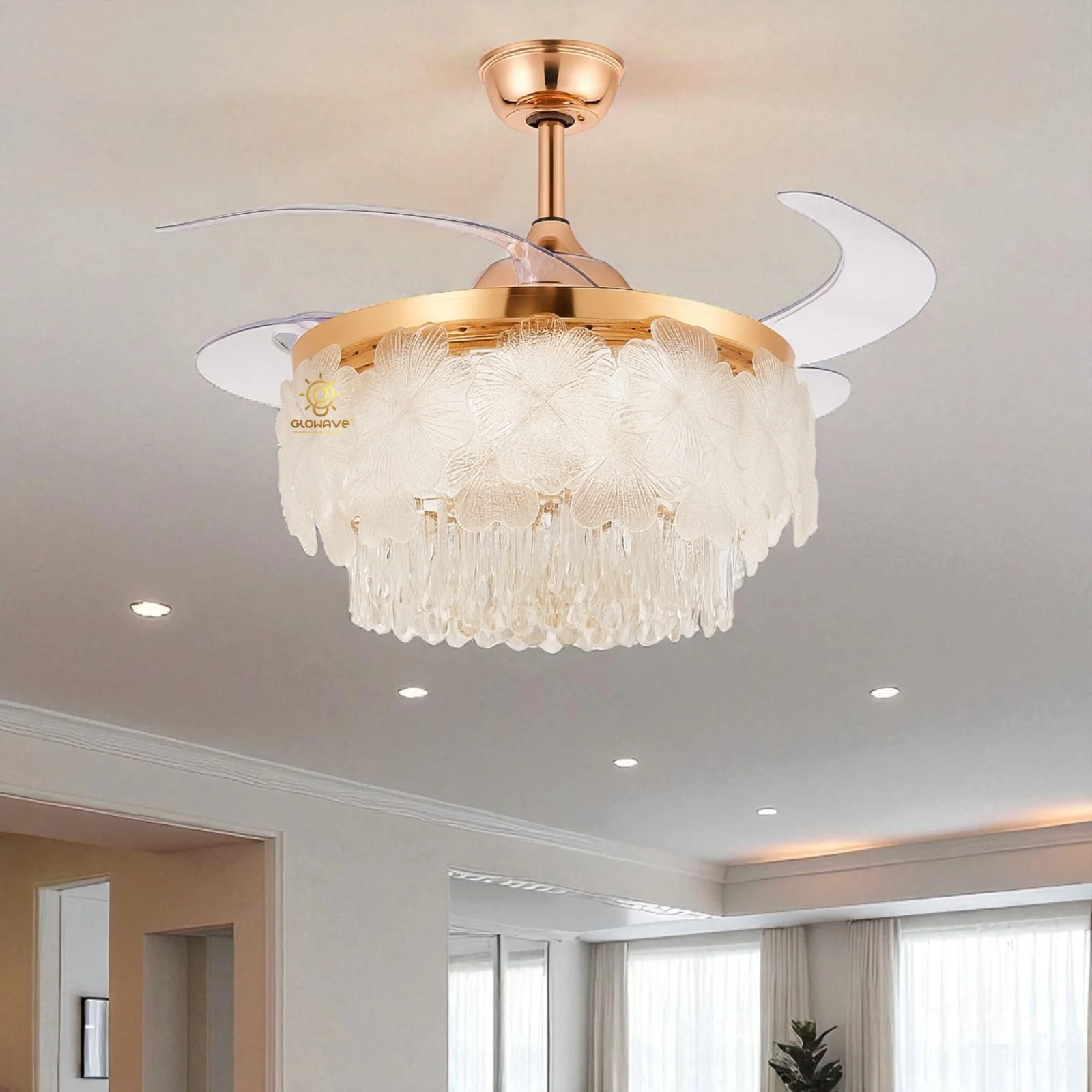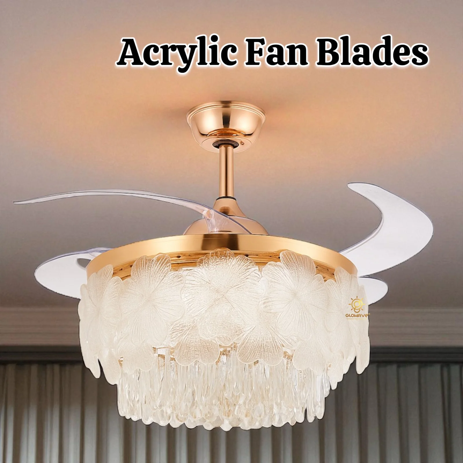 Golden 42 inch Metal Body with Crystal Flowers Retractable Acrylic Fan Blades Chandelier Light - Tricolour (FI 7774)