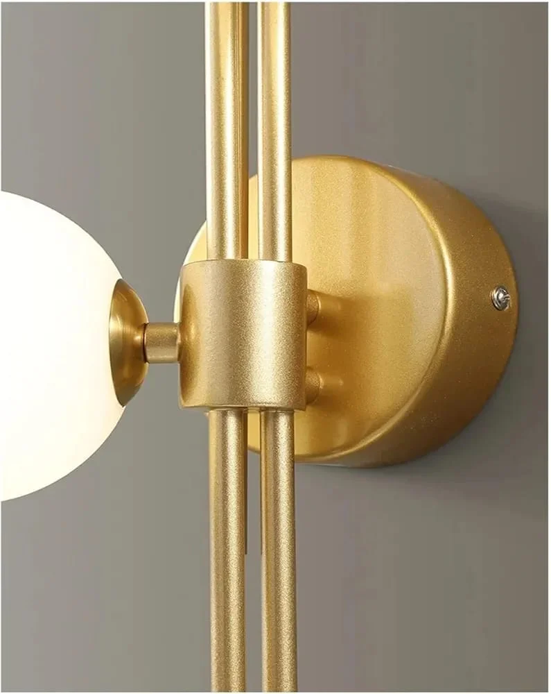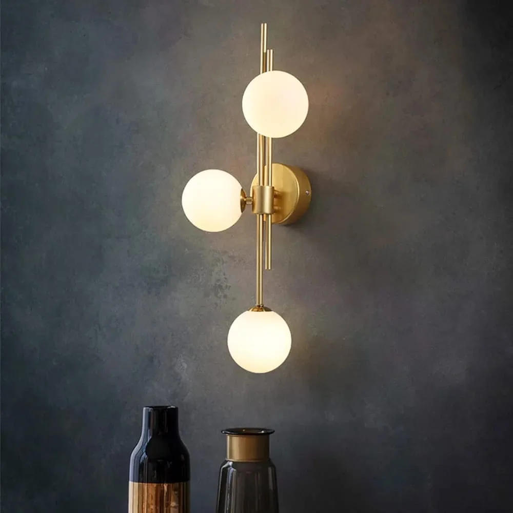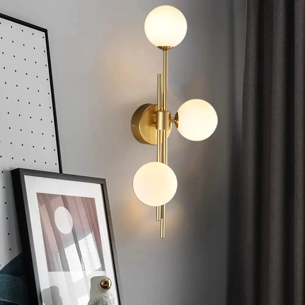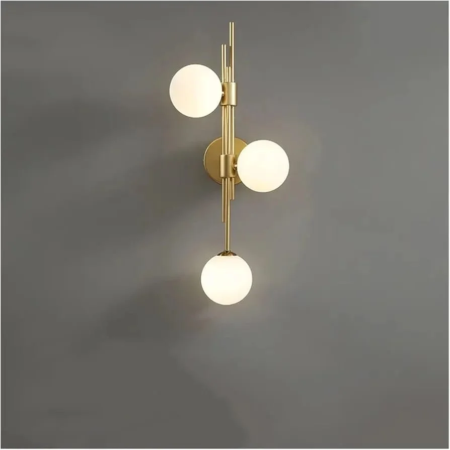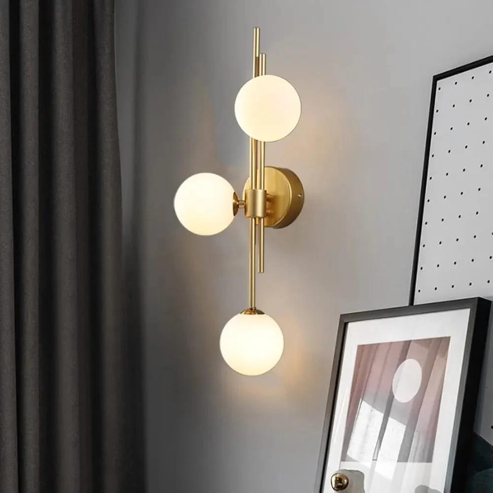 Elevate your living space with the Modern 3 White Glass Balls Golden Finish LED Wall Lamp. This elegant lighting fixture, perfect for your living room, bedroom, or bedside, features a sleek golden finish and contemporary glass balls design. It provides a warm white glow that creates a cozy ambiance. Note: Bulb not included.