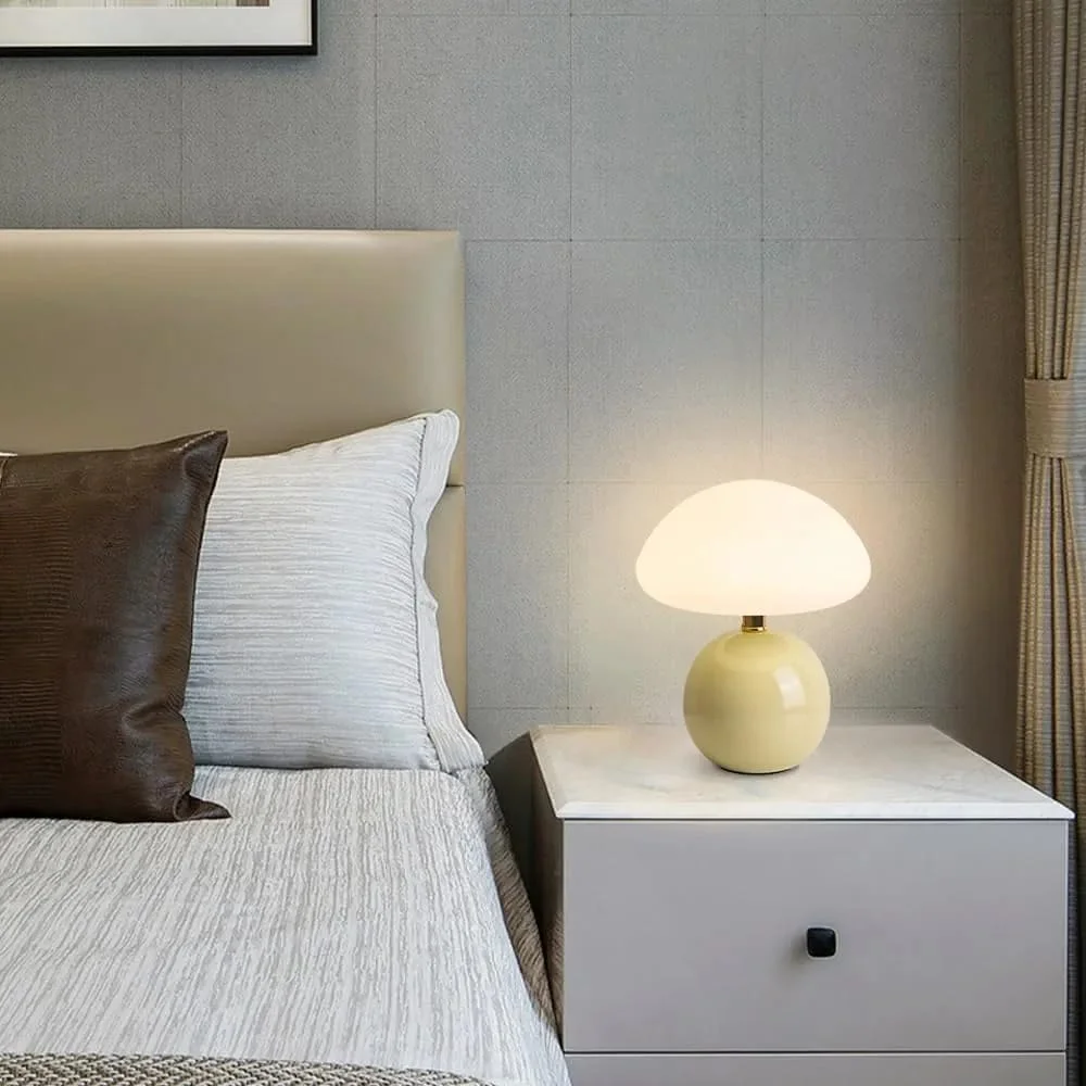 - Stylish glass base with mushroom dome shade