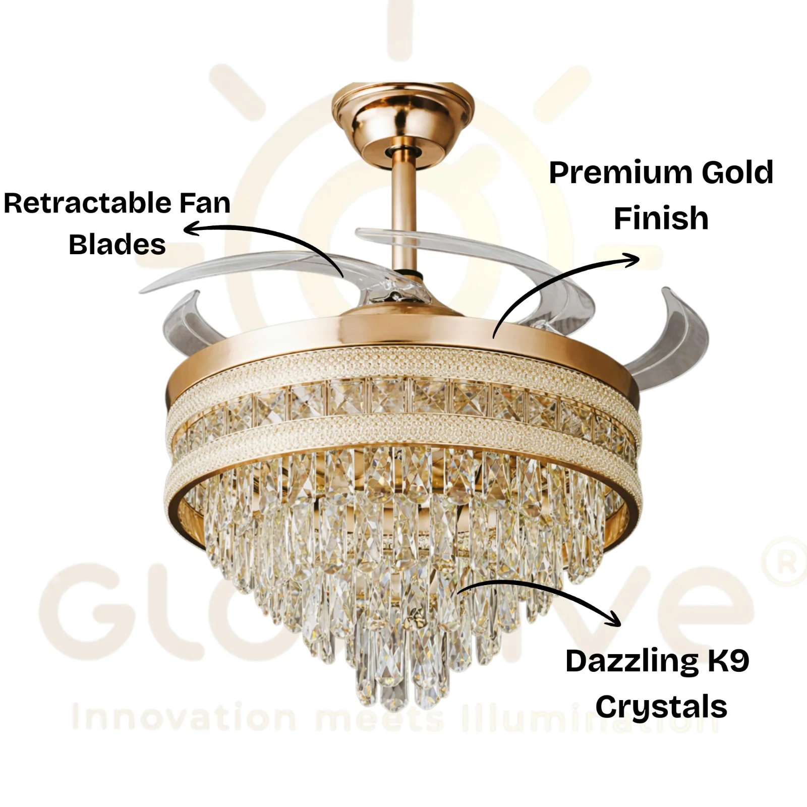 Luxury Gold Crystal Retractable Ceiling Fan with LED Chandelier Light - Tricolor