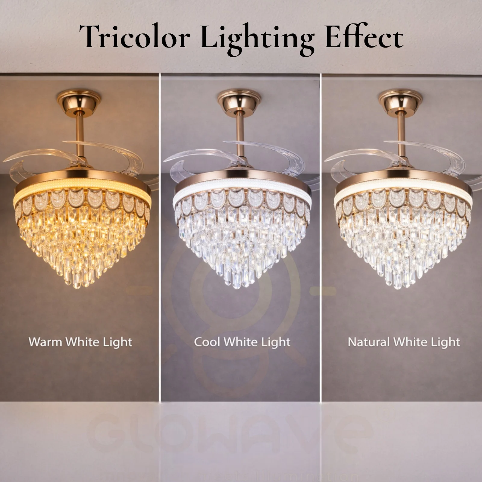 Luxury Chandelier Ceiling Fan with Retractable Blades Crystal Glass Shades - Tricolour