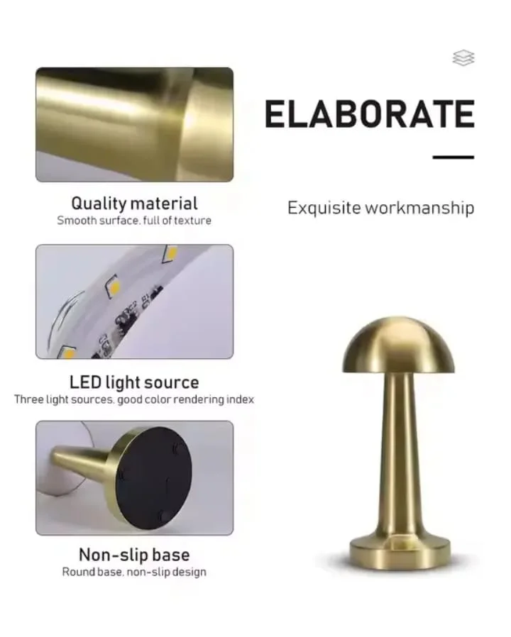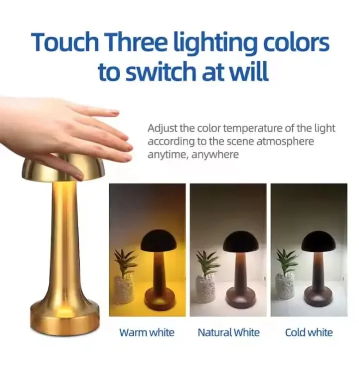 Illuminate your space with elegance and functionality using the Glowave Portable LED Mushroom Table Lamp. With a sleek, mushroom-inspired design, this wireless lamp brings a soft glow to any setting — from cozy bedside corners to elegant dining tables. Featuring a built-in touch sensor with 3 color modes (Warm, Neutral, and Cool White), it adapts to your mood with a simple tap. The dimmable brightness offers personalized comfort, while the rechargeable "C" type USB port ensures hassle-free, cordless use. A modern blend of form and function — perfect for contemporary living.