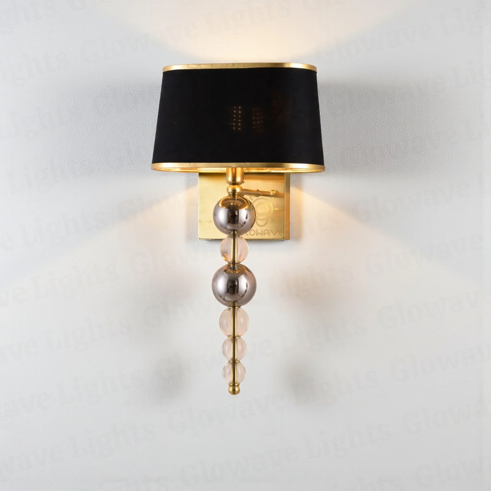 Add timeless elegance to your interiors with this exquisitely designed wall light, crafted to elevate both modern and classic spaces. Featuring a rich black fabric shade with refined gold edging, this wall lamp delivers a soft, ambient glow while making a bold style statement. The elegant vertical arrangement of polished metal and glass bead accents adds depth, texture, and a luxurious visual appeal.