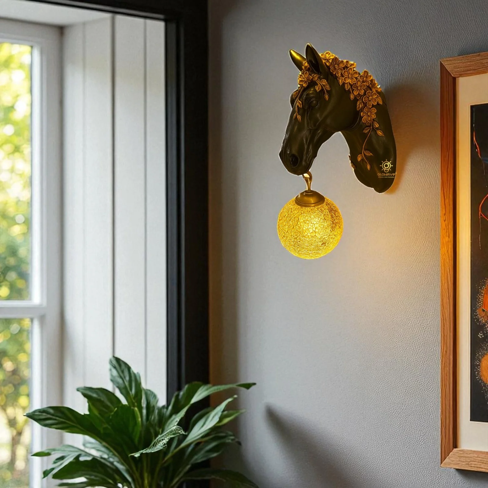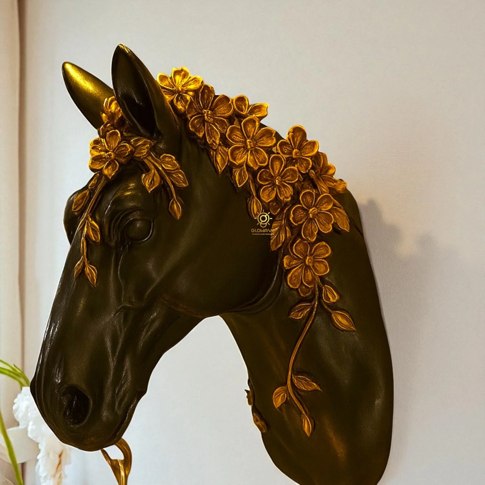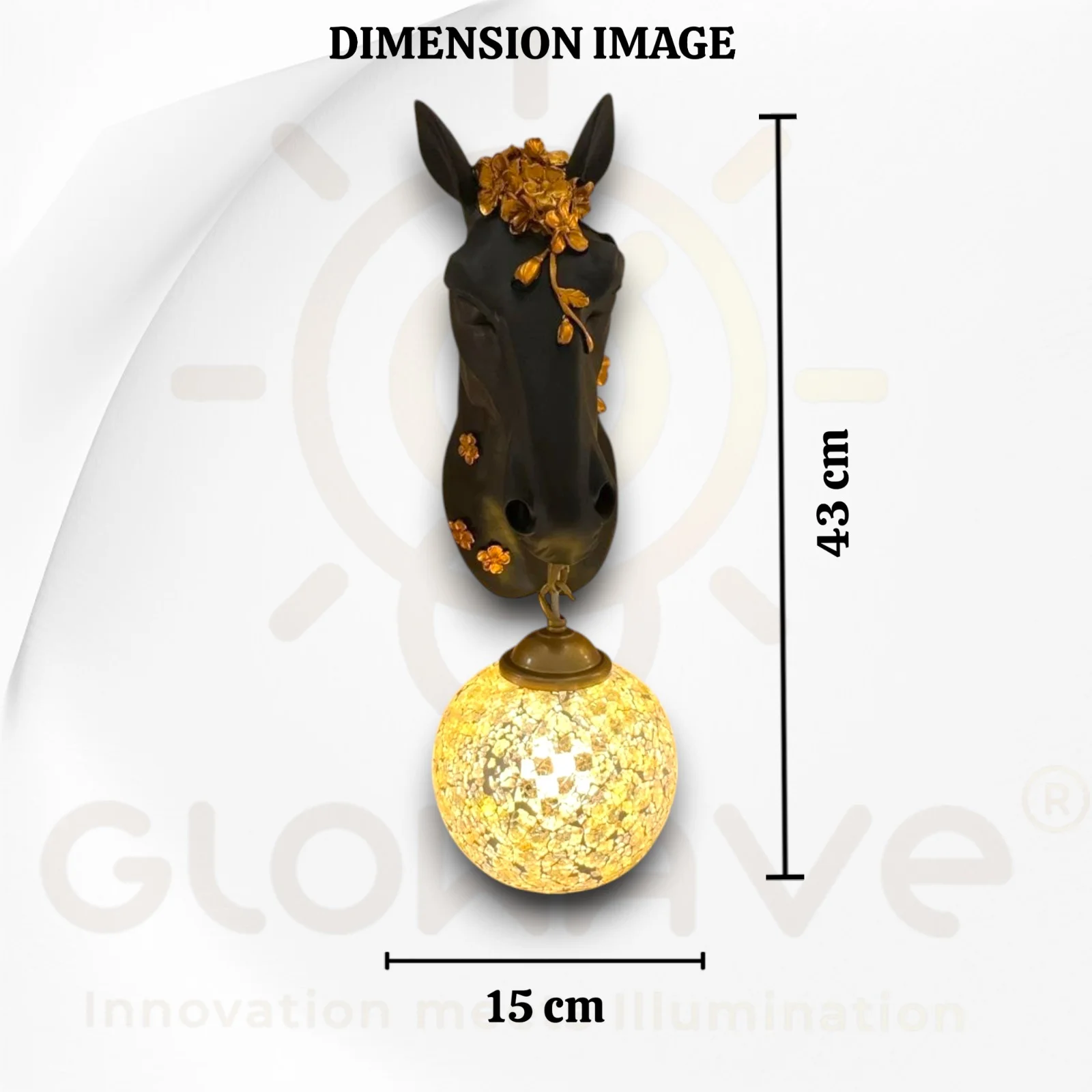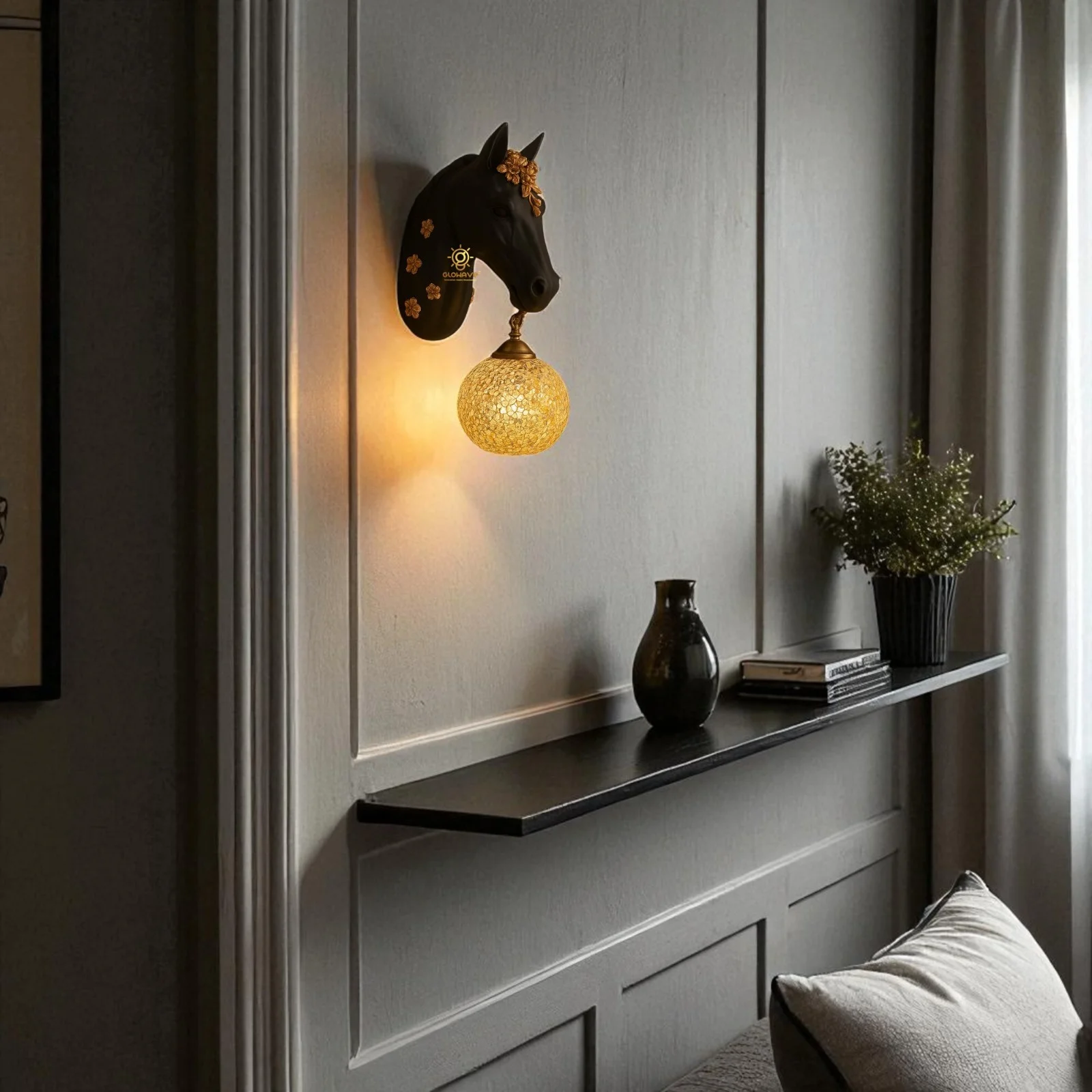 Illuminate your space with the Royal Horse Head Resin Black Wall Lamp, perfect for living rooms, bedrooms, and bedsides. This exquisite warm white lamp features a majestic horse head design, adding a touch of luxury and elegance to any decor. Crafted from high-quality metal with a stunning Black finish, it provides a warm, inviting glow that enhances the ambiance of your home. Ideal for those seeking a blend of sophistication and functionality, this wall lamp is a statement piece that elevates your interior design.
