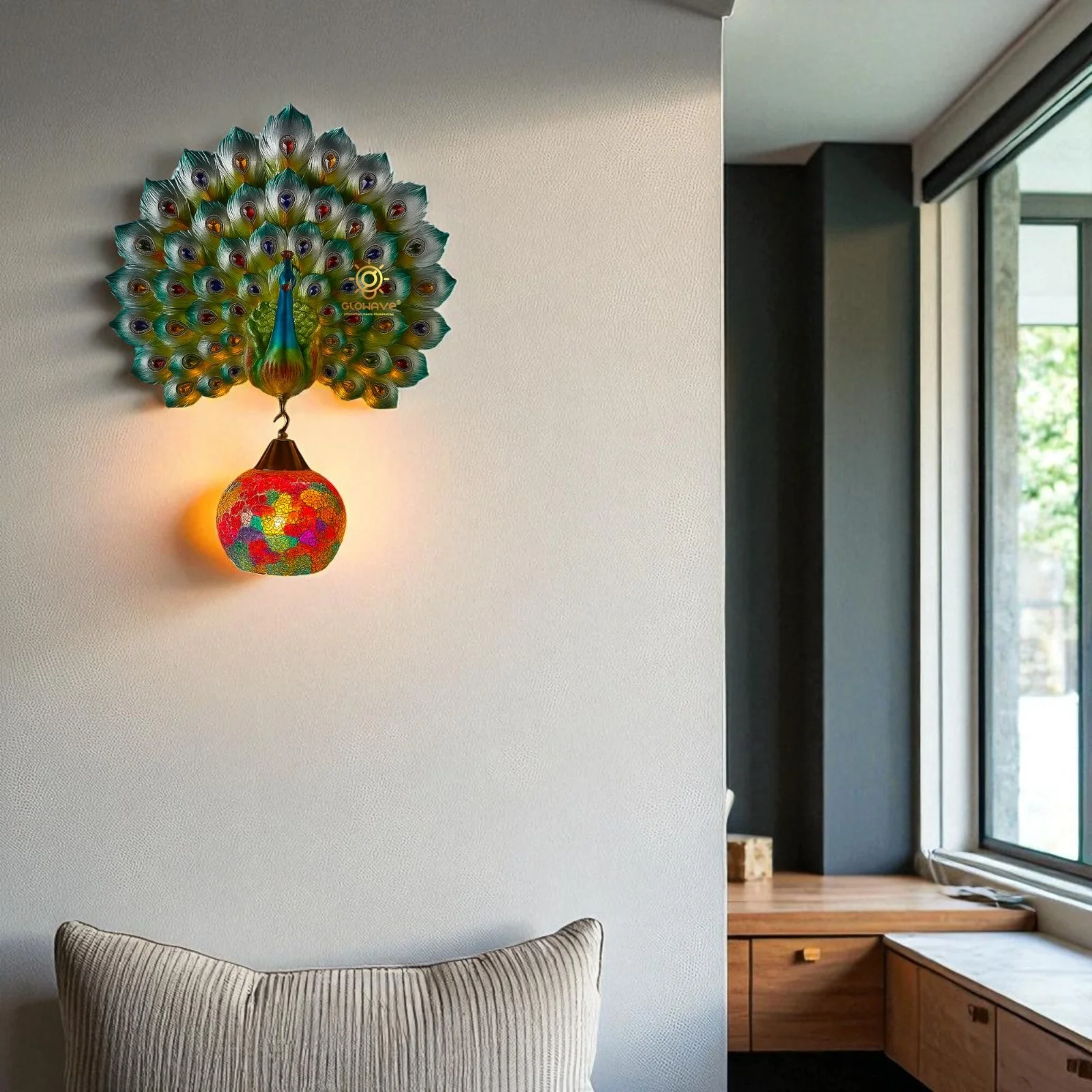 Illuminate your space with the Royal Peacock Resin Multicolour Wall Lamp, perfect for living rooms, bedrooms, and bedsides. This exquisite warm white lamp features a majestic peacock design, adding a touch of luxury and elegance to any decor. Crafted from high-quality metal with a stunning golden finish, it provides a warm, inviting glow that enhances the ambiance of your home. Ideal for those seeking a blend of sophistication and functionality, this wall lamp is a statement piece that elevates your interior design.