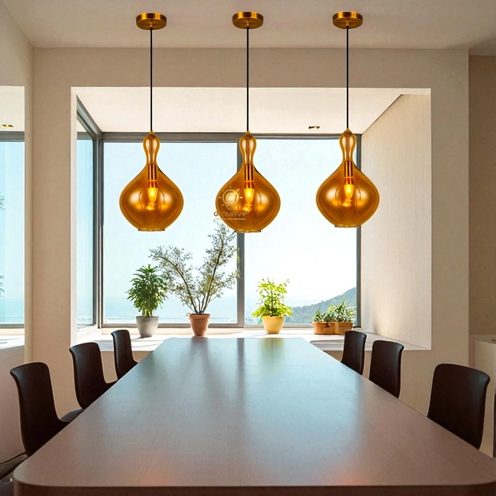 Vintage Metal Gold Brass Finish Amber Glass Pendant Hanging Lamp - Warm White