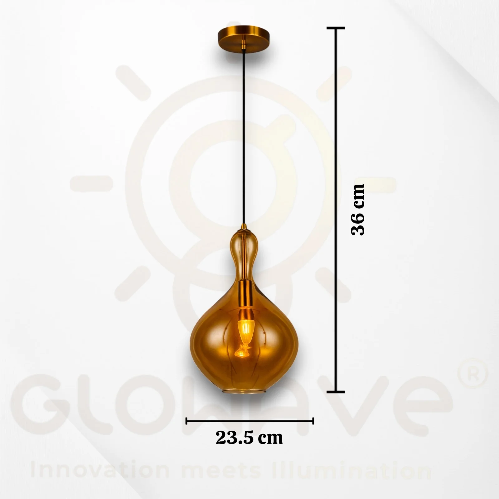 Stylish Gold Finish Drop Shape Amber Glass Hanging Lamp Light - Warm White (7814-1P/AM)