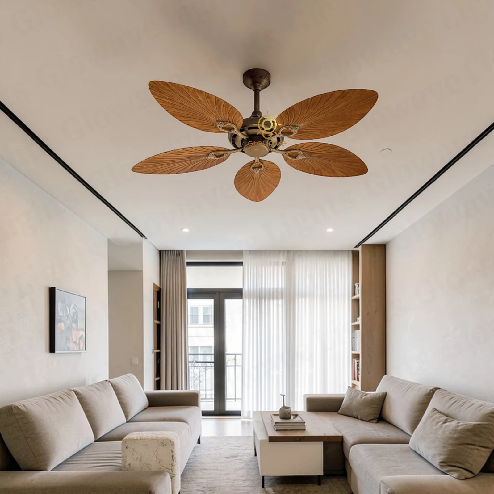 Tropical Leaf Design Ceiling Fan with Wooden Finish Blades Decorative Fan with Reversible Motion Remote Control