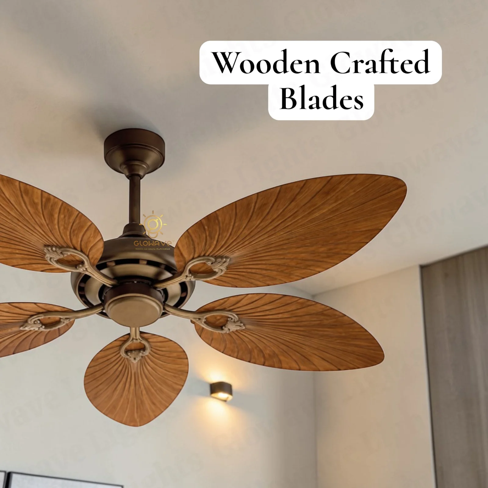 Transform your space into a serene retreat with this beautifully crafted tropical leaf ceiling fan, designed to blend elegance with functionality. Featuring intricately carved wooden-finish blades inspired by natural palm leaves, this fan adds a warm, luxurious touch to any interior or semi-outdoor setting. The rich texture and detailed design make it a perfect statement piece for living rooms, bedrooms, balconies, or patios.