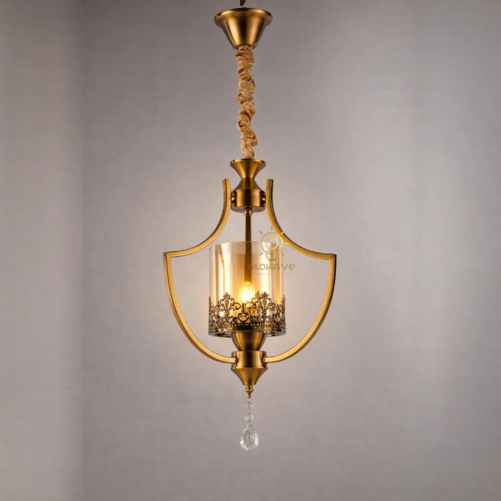 The light brings subtle vintage charm that contrasts beautifully with its clean, modern structure. At the center, a clear cylindrical glass shade with intricate metal detailing softly diffuses the light, creating a calm and luxurious ambiance. The inner curved metal element adds depth and visual interest, making this pendant a true statement piece.