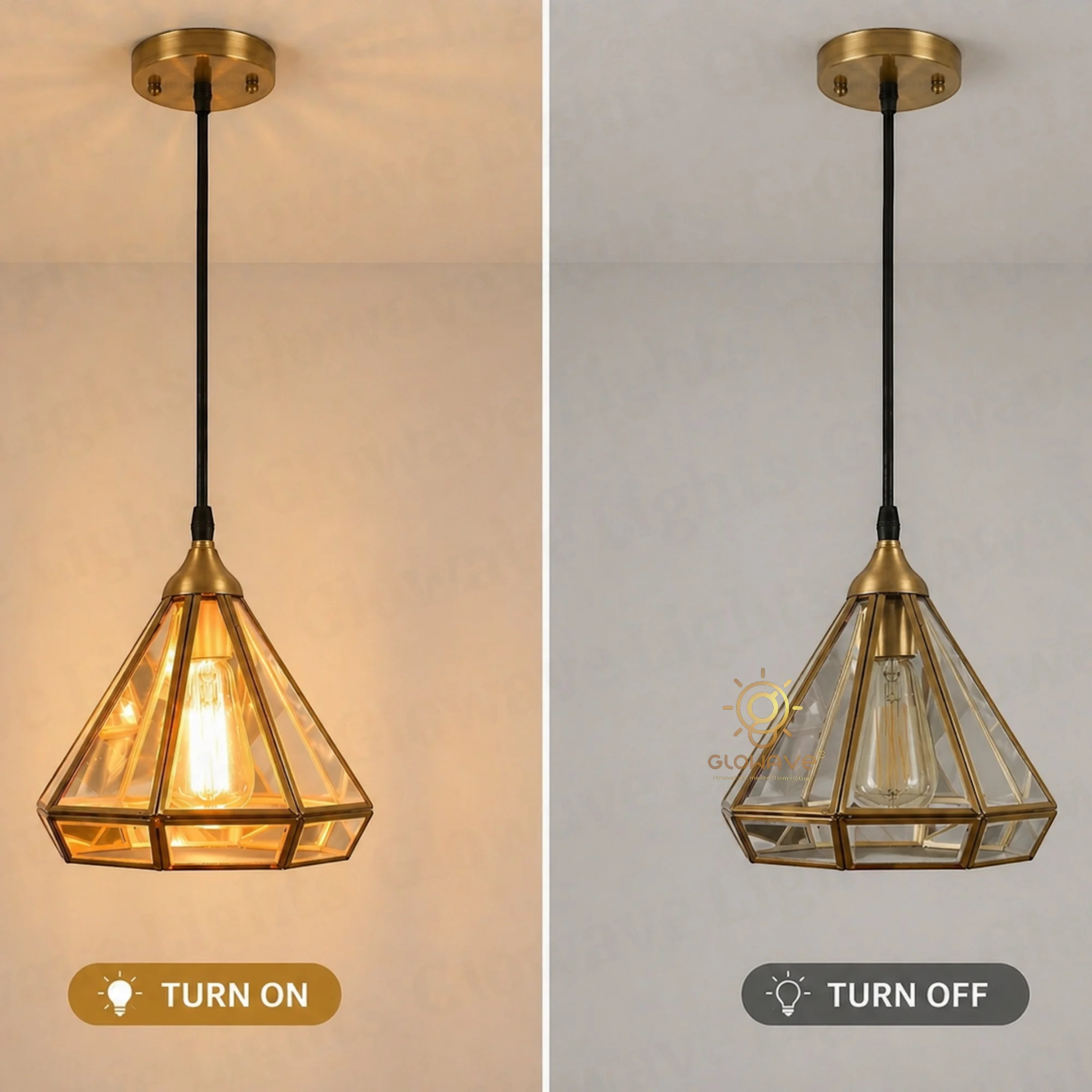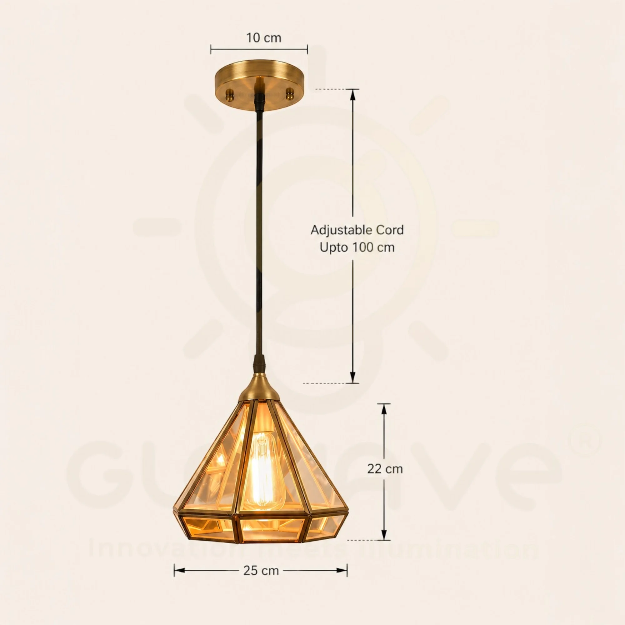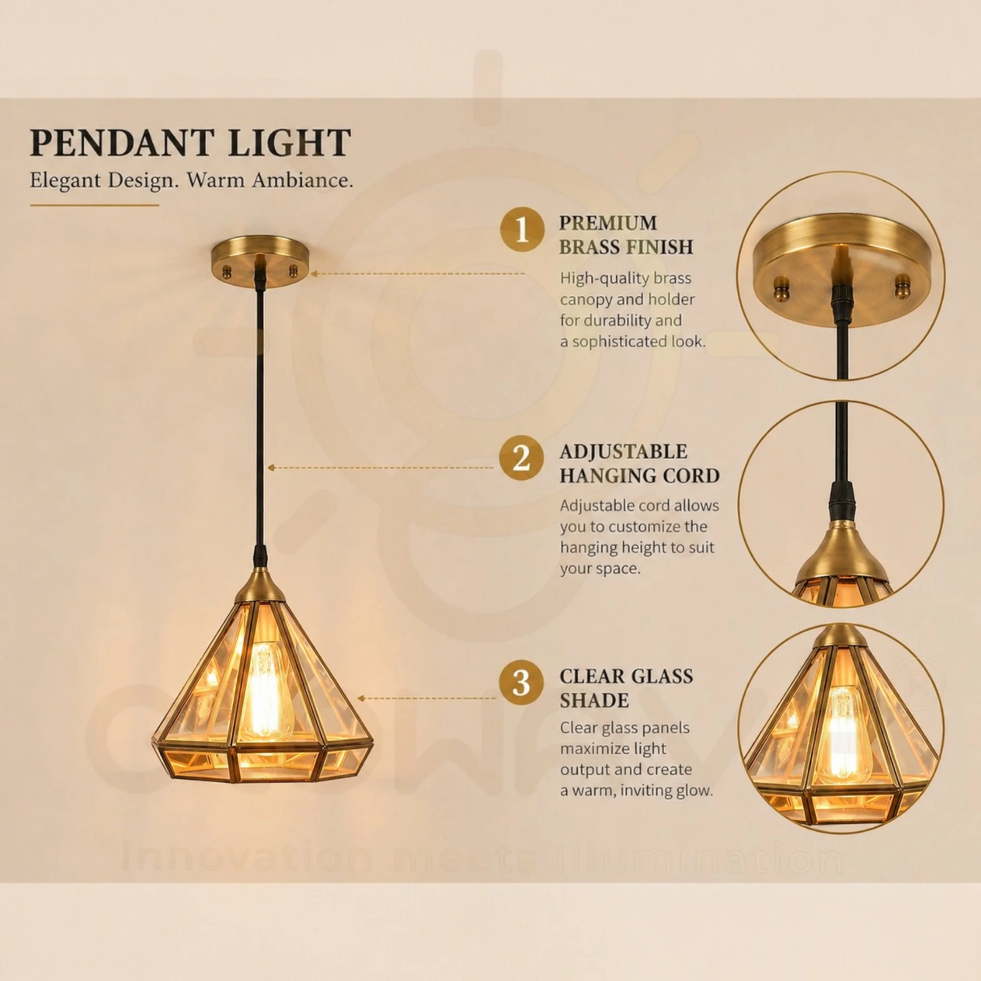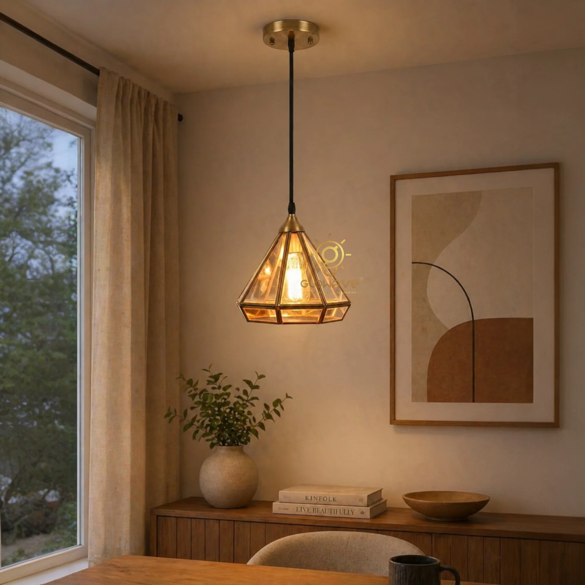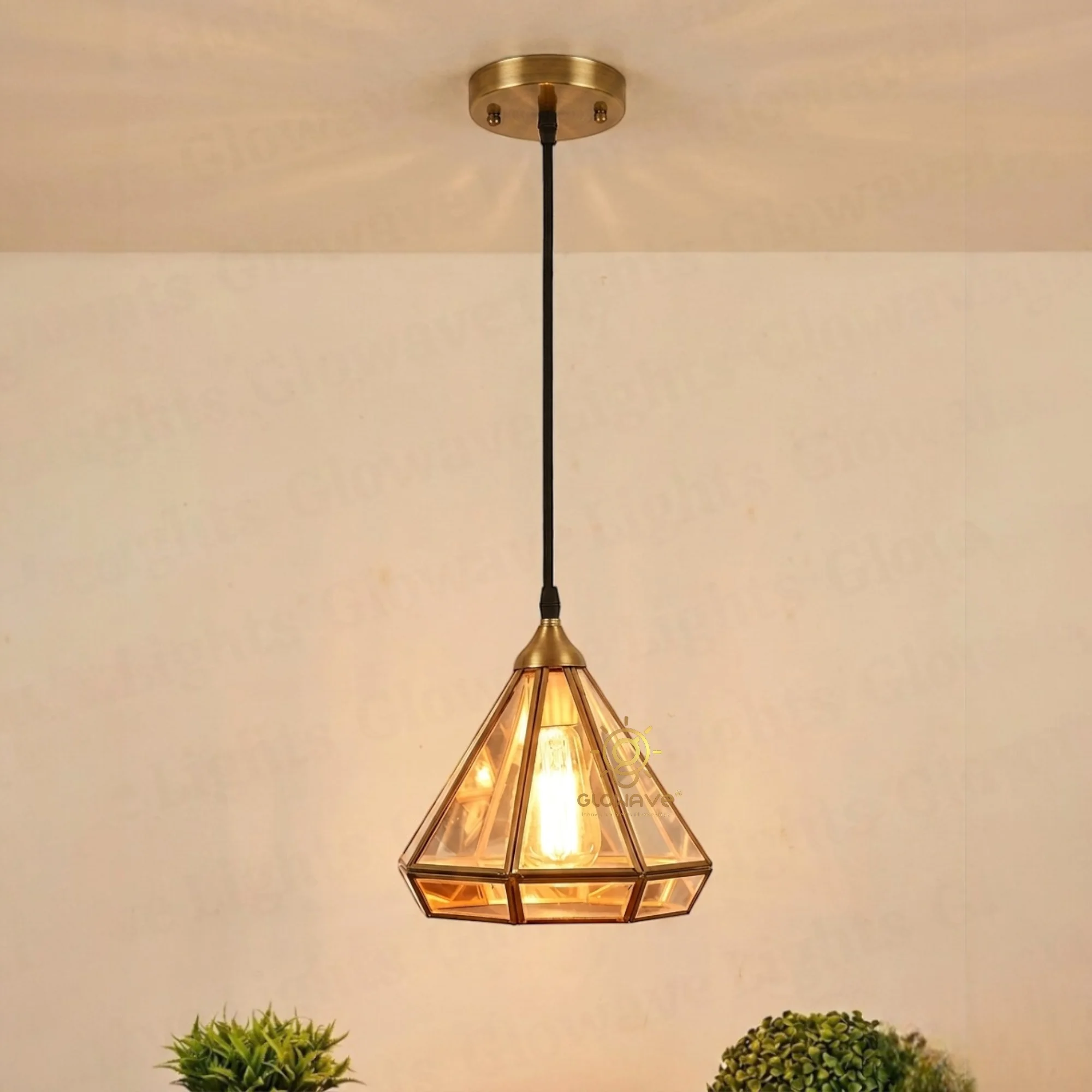 Elevate your interiors with this modern geometric pendant light, designed to bring a perfect balance of elegance and warmth to any space. Featuring a premium brass finish combined with a clear glass shade, this hanging light creates a beautiful ambient glow that enhances your décor effortlessly. Crafted with durable materials and attention to detail, this ceiling light is not only visually appealing but also long-lasting and easy to install—perfect for modern homes and commercial settings alike.