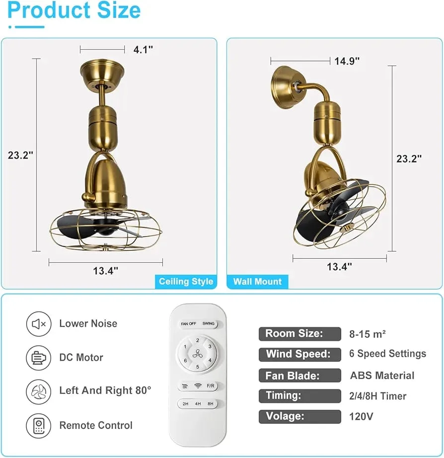 Wall Mounted Fan with Cage Gold Finish Adjustable Wall Fan