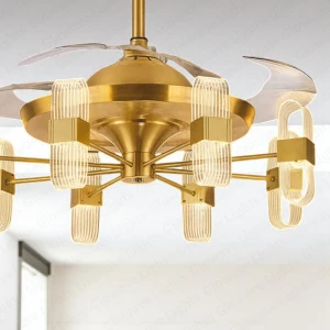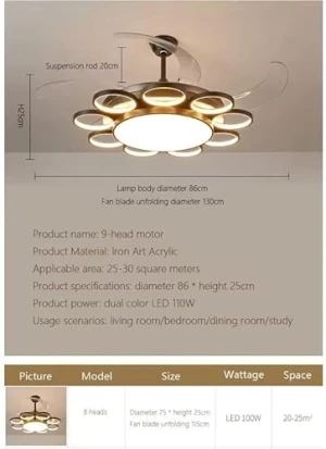 9 Rings Light Chandelier Fan 52 Inch Gold Retractable Blades - Tricolour