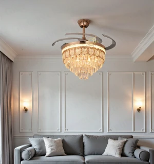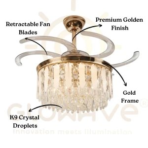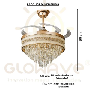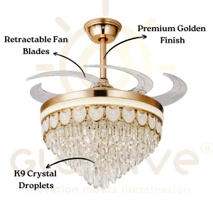 Luxury Gold Crystal Retractable Ceiling Fan with LED Chandelier Light - Tricolor