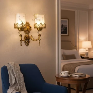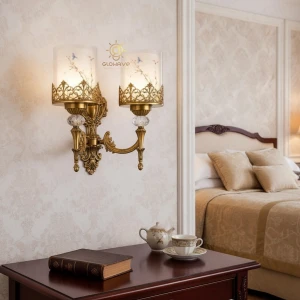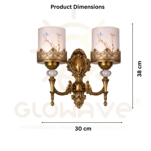 Gold Double Wall Light with Decorative Glass Shade & Crystal Accent Wall Lamp - Warm White