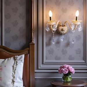 Antique Gold Wall Sconce with Glass Shades & Crystal Drop Wall Lamp - Warm White