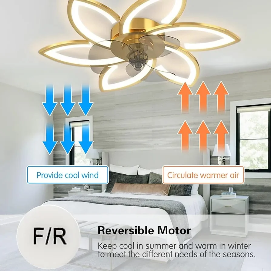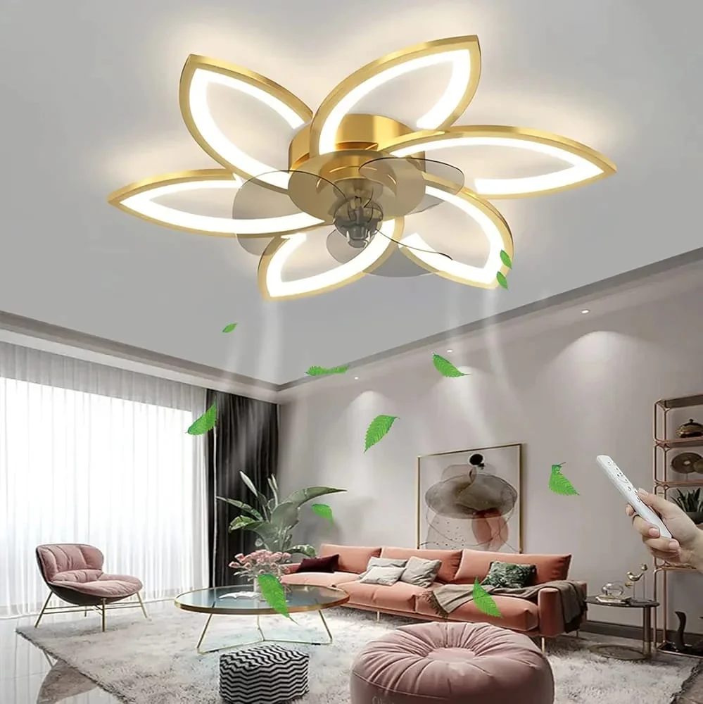 Elevate your living space with the Luxury Golden Flower Shape Ceiling Fan Light. This stunning fan lighting fixture features a sophisticated design with accents, adding a touch of luxury to any room. With three adjustable color lights, it seamlessly adapts to your desired ambiance. Ideal for living rooms, bedrooms, dining areas, entrances, showrooms, and cafés, this versatile chandelier combines style and functionality. The ABS blades provide efficient air circulation when extended and a sleek, unobtrusive look when retracted. Enjoy a blend of elegance and practicality with this exquisite ceiling fan light.