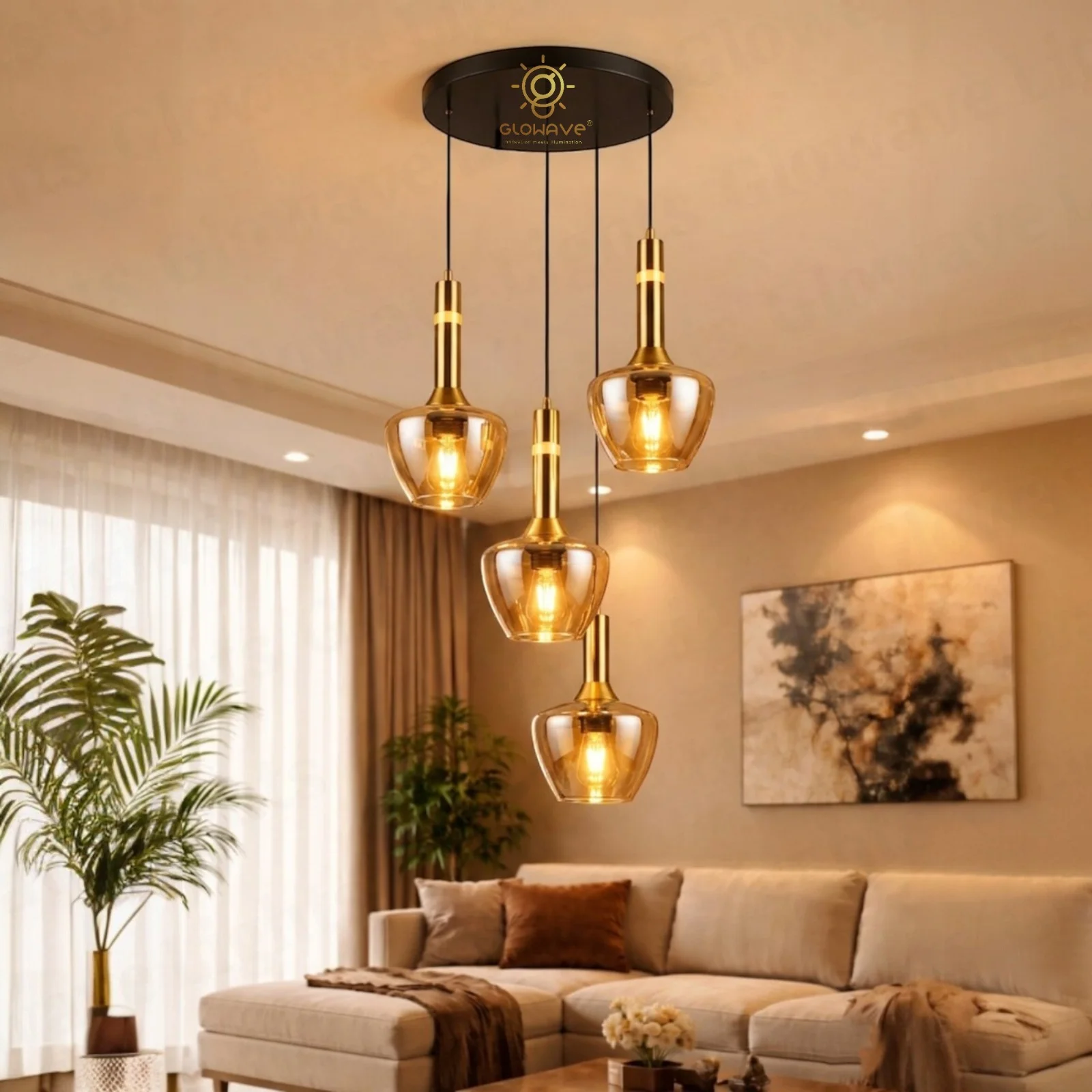 Bring a perfect blend of luxury and warmth into your home with this stunning 4-Light Pendant Hanging Lamp. Designed with premium amber glass shades and a sleek gold finish, this ceiling light creates a cozy, inviting glow that transforms any room into a sophisticated living space.