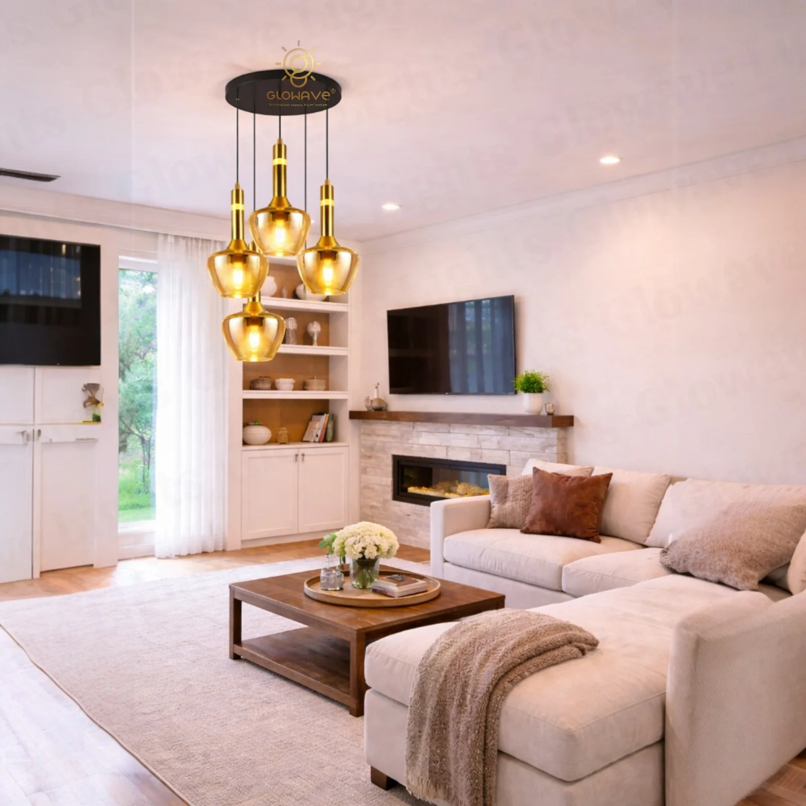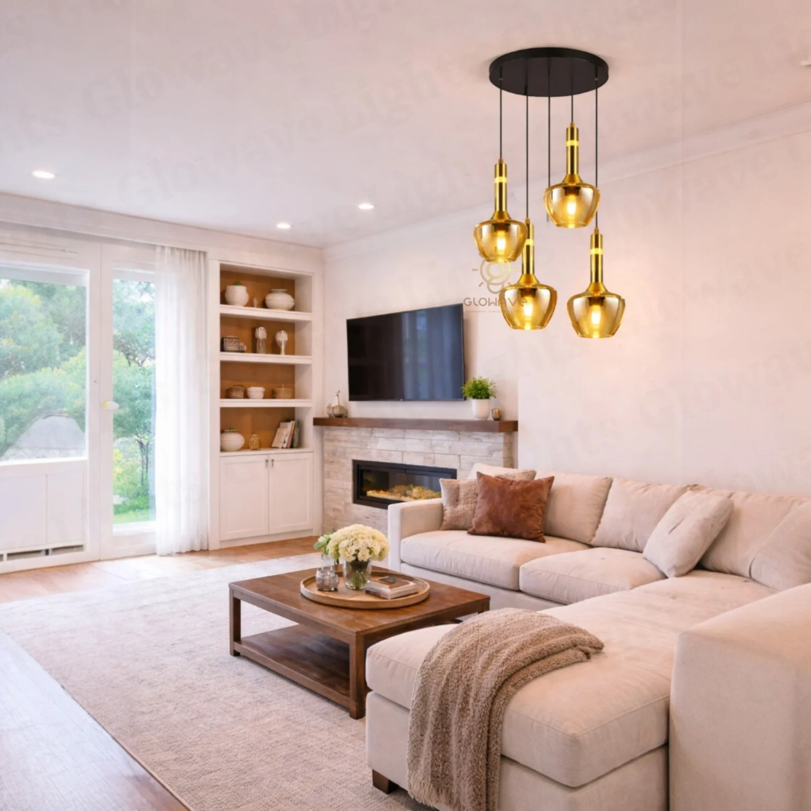 - Elegant 4-light cluster pendant featuring amber glass shades with a luxurious gold finish—perfect for adding a modern yet warm touch to any interior.