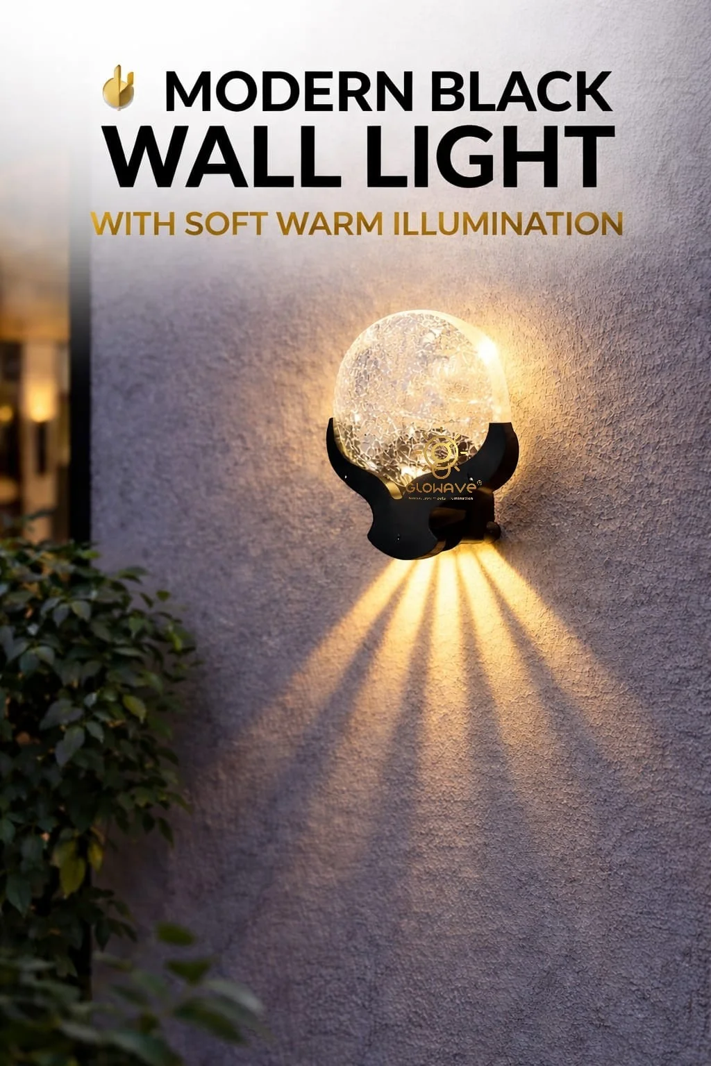 Enhance your living spaces with the elegant Glowave Decorative Wall Light, crafted to blend modern aesthetics with functional lighting. Featuring a beautifully textured glass globe held by a sturdy black metal body, this wall light creates a warm and soothing up & down light effect that adds depth and character to any wall.Perfect for both indoor and outdoor settings, the Glowave wall light delivers ambient illumination while elevating the décor of gardens, balconies, living rooms, corridors, and exterior walls. Its premium materials ensure durability, while the artistic light spread creates a luxurious atmosphere, making it an ideal choice for modern homes and hospitality spaces.