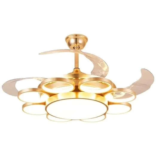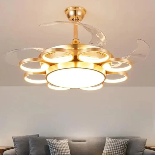 Elevate your living space with the Luxury Golden 9 Rings Ceiling Fan Chandelier. This stunning retractable fan lighting fixture features a sophisticated design with light rings accents, adding a touch of luxury to any room. With three adjustable color lights, it seamlessly adapts to your desired ambiance. Ideal for living rooms, bedrooms, dining areas, entrances, showrooms, and cafés, this versatile chandelier combines style and functionality. The retractable blades provide efficient air circulation when extended and a sleek, unobtrusive look when retracted. Enjoy a blend of elegance and practicality with this exquisite ceiling fan chandelier.