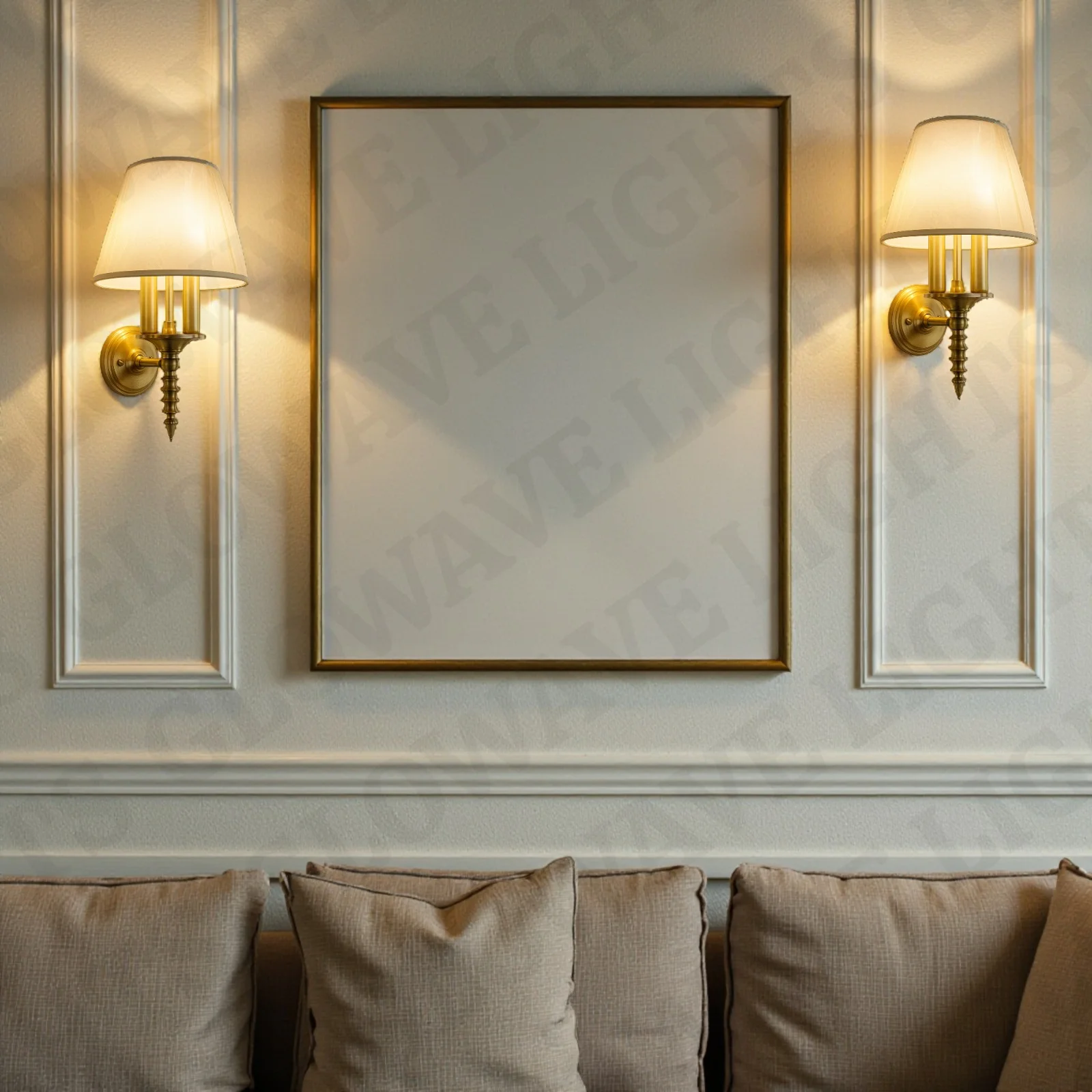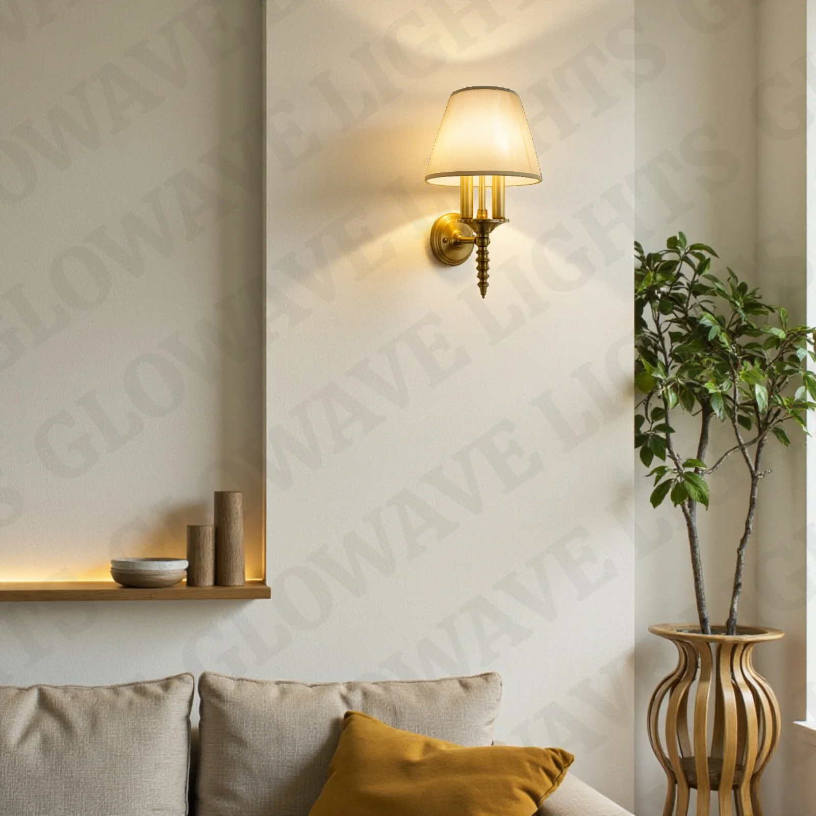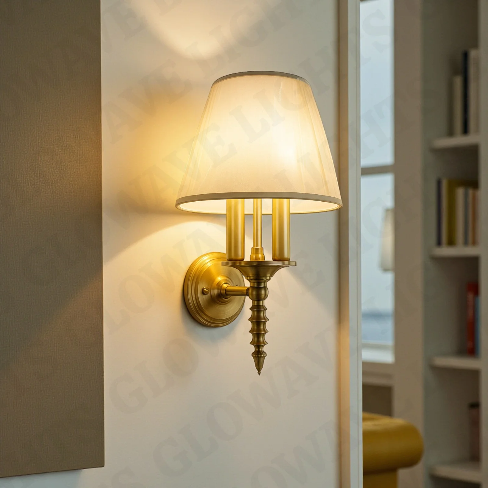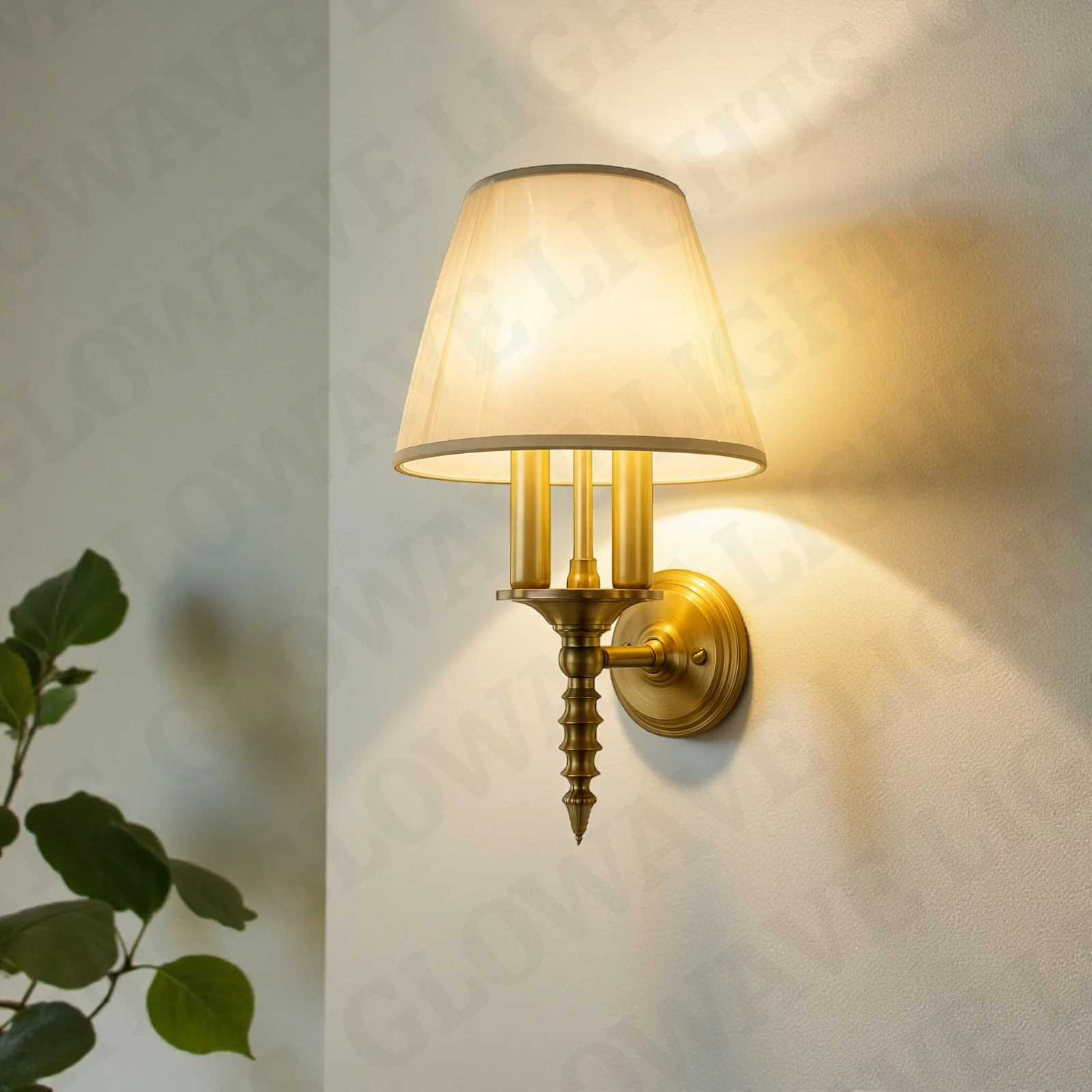 - Stylish Design: Gold Finish Fabric Shade Wall Sconce.