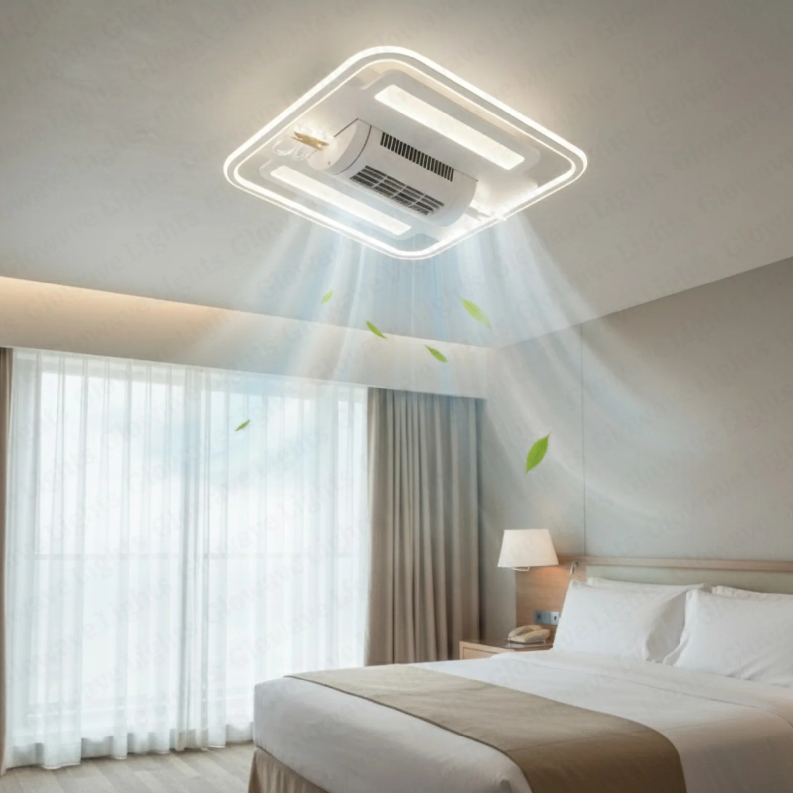 Elevate your living space with the Luxury White Square Ceiling Fan Light. This stunning fan lighting fixture features a sophisticated design with accents, adding a touch of luxury to any room. With three adjustable color lights, it seamlessly adapts to your desired ambiance. Ideal for living rooms, bedrooms, dining areas, entrances, showrooms, and cafés, this versatile chandelier combines style and functionality. The seamless blades provide efficient air circulation when extended and a sleek, unobtrusive look when retracted. Enjoy a blend of elegance and practicality with this exquisite ceiling fan light.