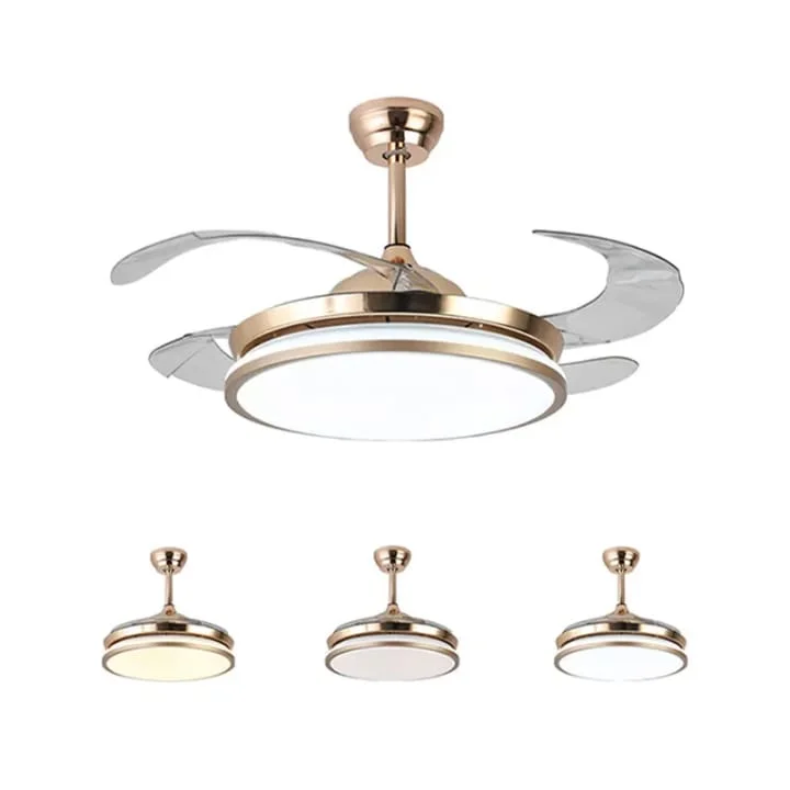 Elevate your living space with the Luxury Golden Ceiling Fan Chandelier. This stunning retractable fan lighting fixture features a sophisticated design with accents, adding a touch of luxury to any room. With three adjustable color lights, it seamlessly adapts to your desired ambiance. Ideal for living rooms, bedrooms, dining areas, entrances, showrooms, and cafés, this versatile chandelier combines style and functionality. The retractable blades provide efficient air circulation when extended and a sleek, unobtrusive look when retracted. Enjoy a blend of elegance and practicality with this exquisite ceiling fan chandelier.