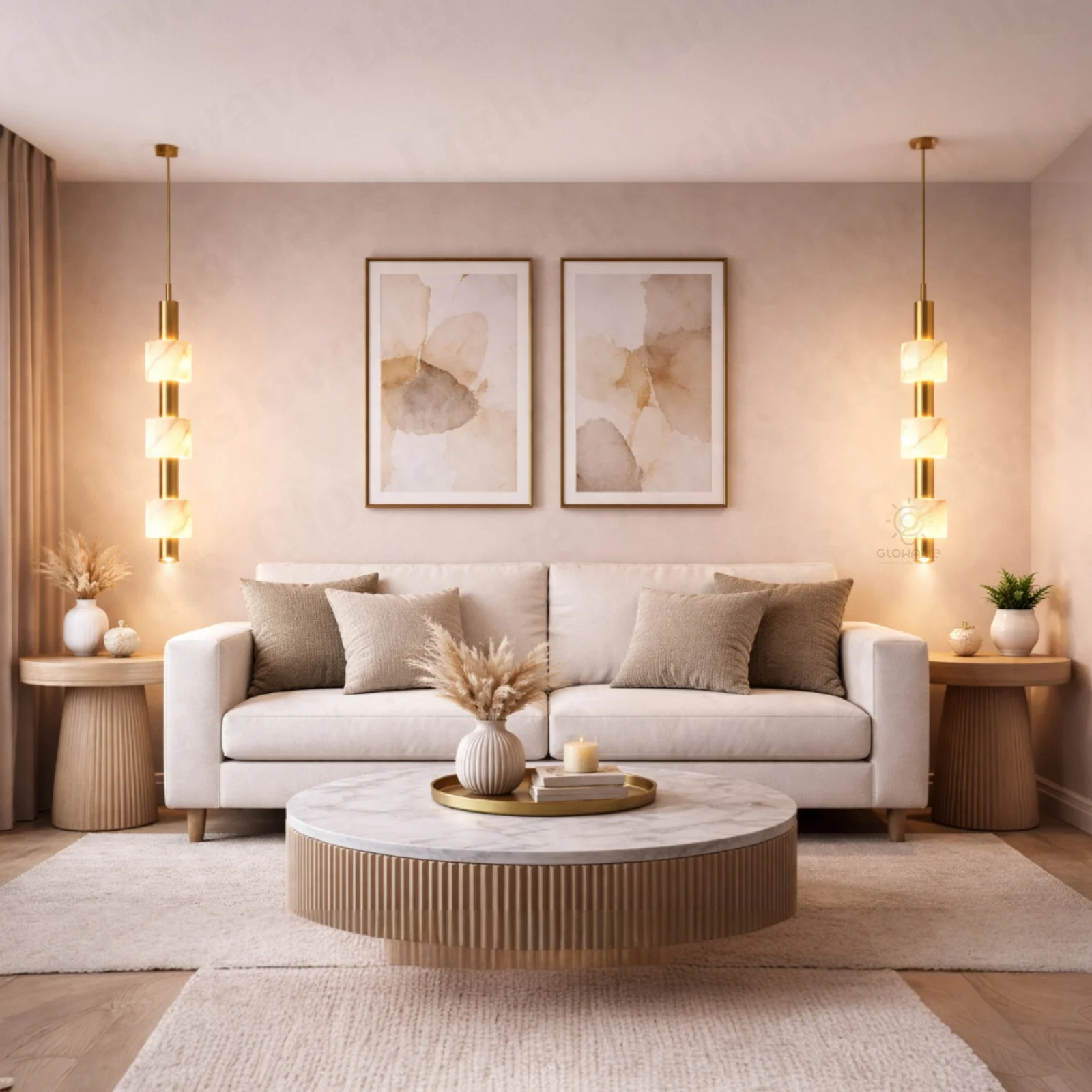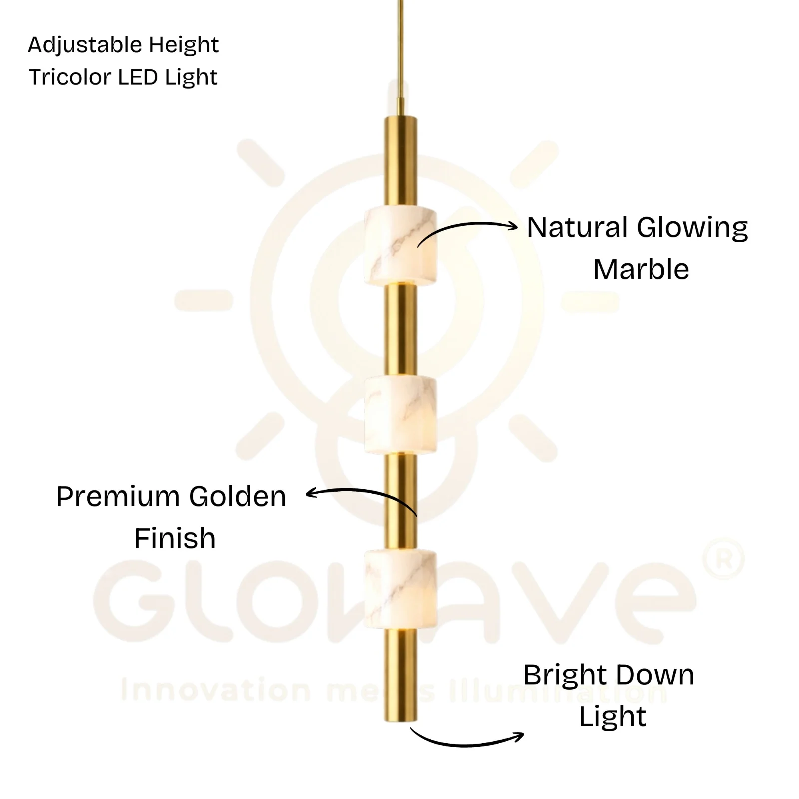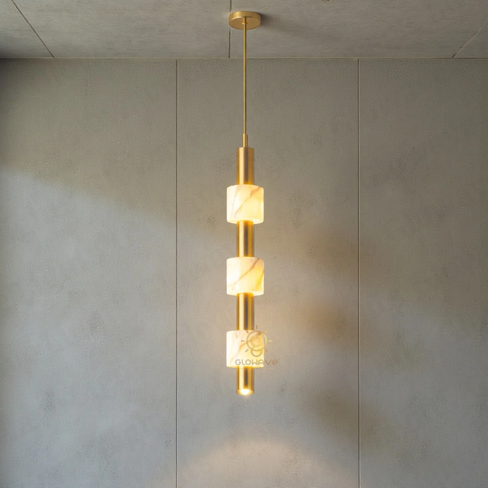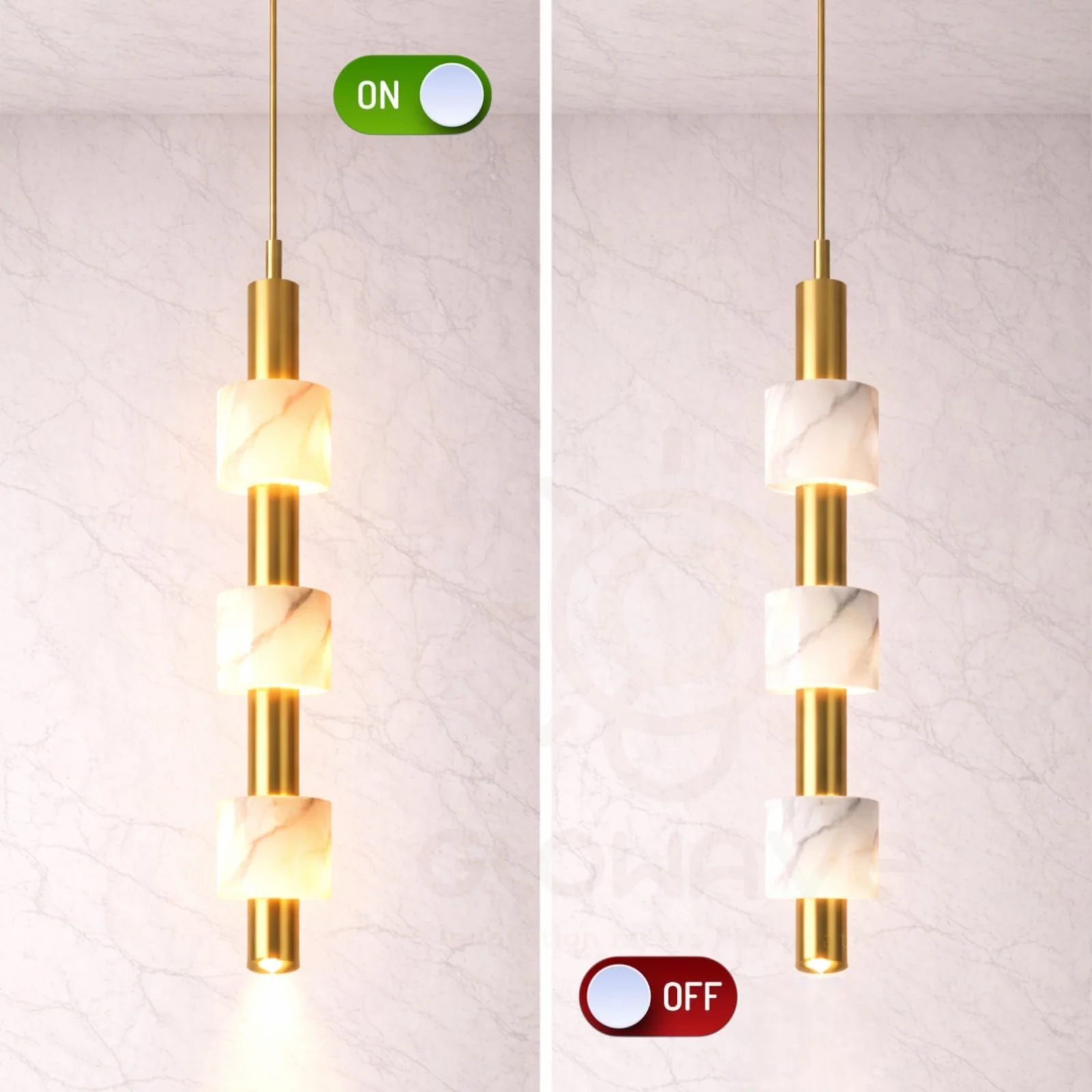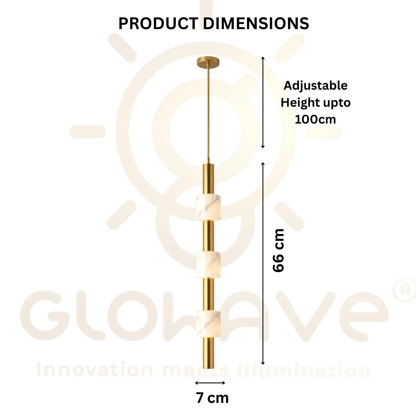 Introduce refined vertical elegance to your interiors with this modern gold and marble linear pendant light. Designed with a premium golden finish metal frame and natural glowing marble cylinders, this suspension light delivers a perfect balance of luxury aesthetics and functional illumination.