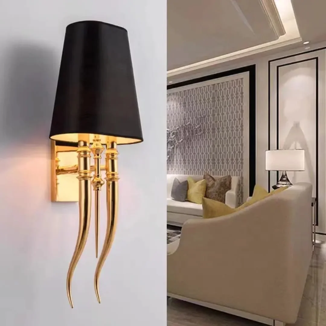 Enhance your home decor with the Gold Finish Base Black Fabric Lampshade Wall Lamp. This exquisite sconce fixture, perfect for living rooms, bedrooms, and bedsides, boasts a timeless antique brass finish and amber glass design. It casts a warm white light, creating a cozy and nostalgic atmosphere. Ideal for adding vintage charm to any space.